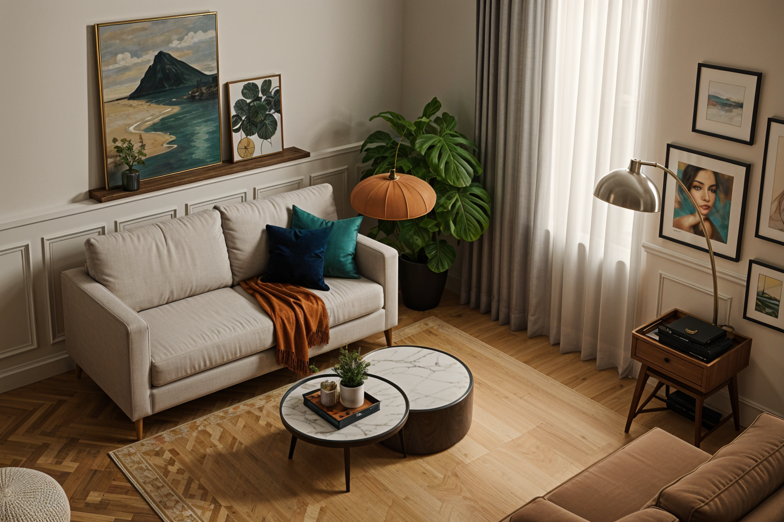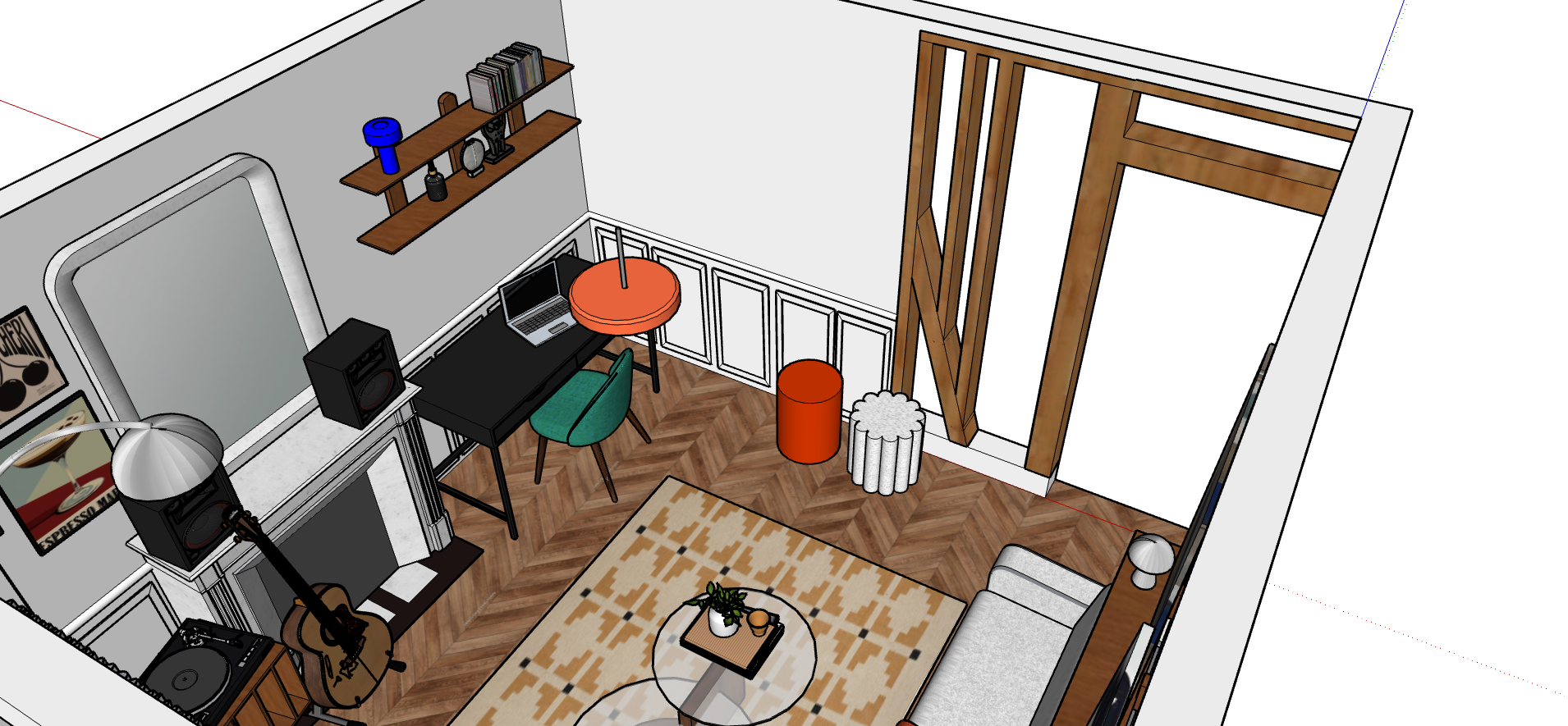 interior shot on the top right of the picture those are wooden beam the table on the middle is made of transparent glass the little lamp on the top is made of chrome metal the orange round on the middle is a lamp fixed on the ceiling