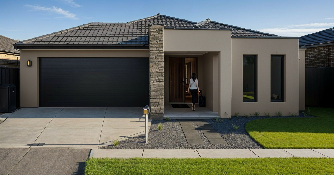 backround is small houses in a small front parcll on the left is terrace for sitting and on the right parcel is small kids playground add grass