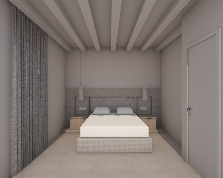 create a high end photorealistic render of a bright luxurious bedroom with a refined and expensive feel the materials should feel authentic with realistic texture the flooring is matte with a polished cement look in a sand off white shade cohesive and elegant the lighting should be warm natural and balanced maintaining a bright atmosphere add beautifully arranged high quality bed linens with soft folds and a soft aesthetic the overall mood should feel contemporary sophisticated bright and editorial as if photographed for a luxury interior design magazine keep the initial materials like cotton linen the headbed travertino light oak wood the pendant lights above the nightstands has a fabric like surface has fine pleats forming two overlapping layers that create a dynamic textured look the headbed sand beige fabric around the wood cornice and the other material on the wall until thwe half one is travertino