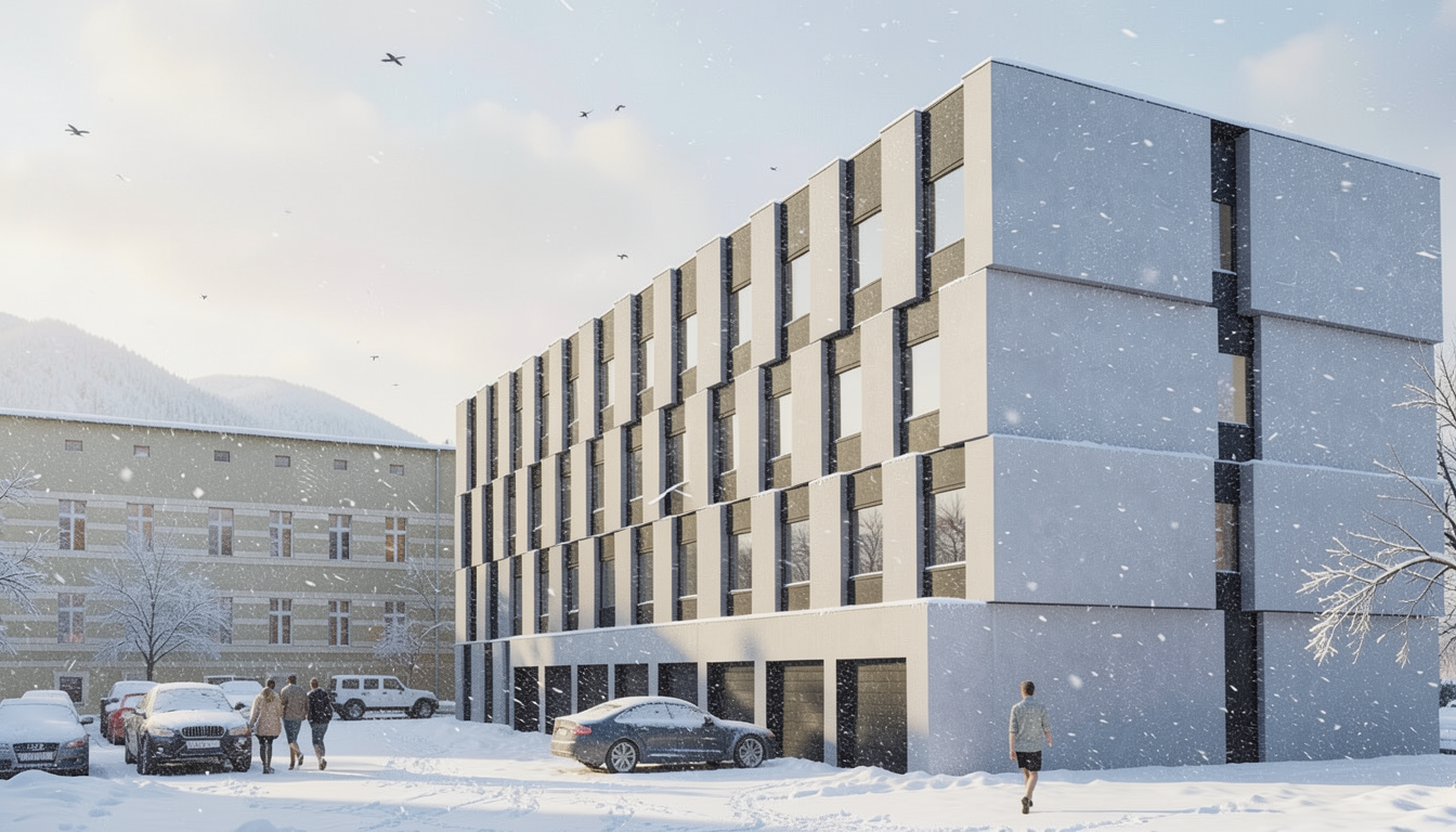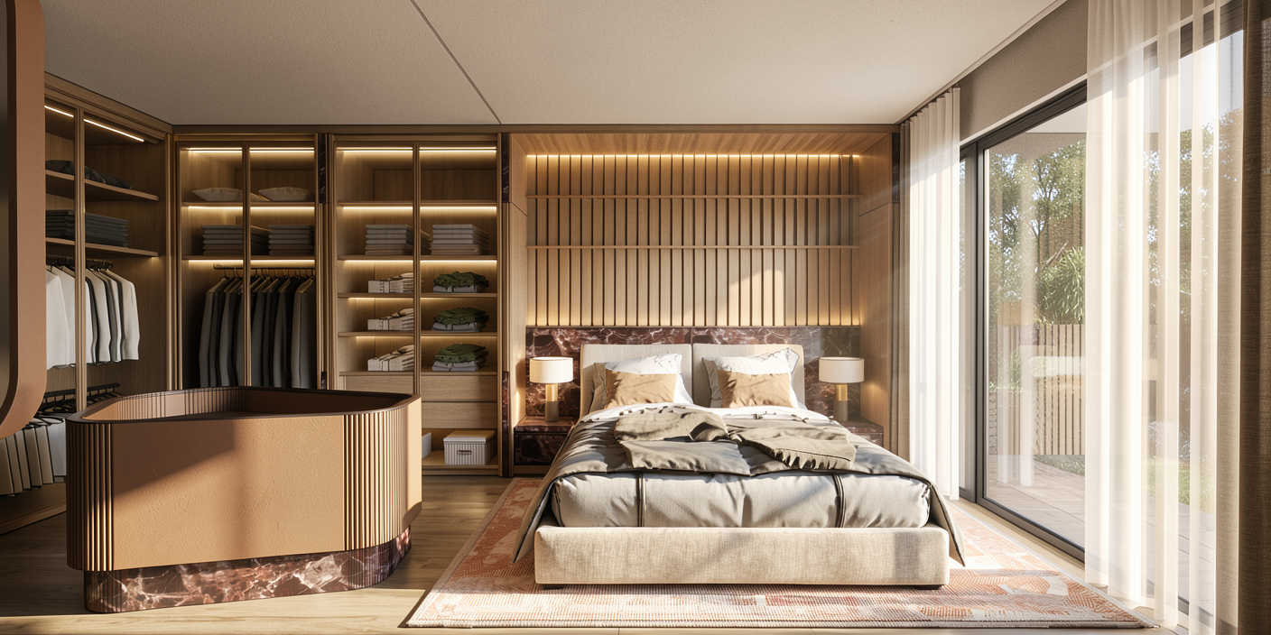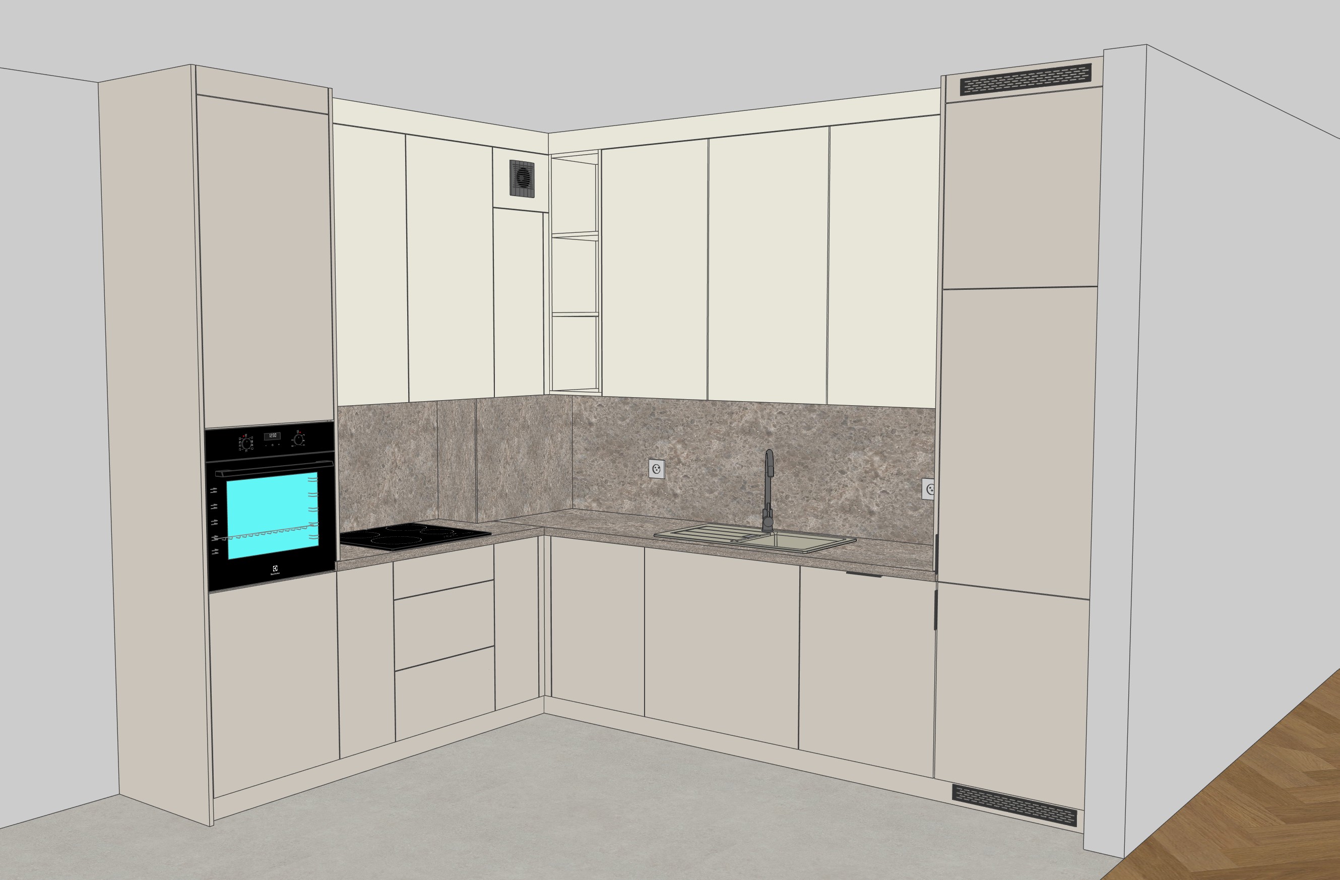 create a render in hyper realistic architectural visualization quality 8k resolution all cabinets appliances vent grilles outlets shelves and fixtures must remain exactly in place do not add or delete any objects from the image the spatial configuration must remain unchanged soft natural daylight from the left gentle shadows smooth matte surfaces on cabinet fronts subtle sheen on the stone countertop and backsplash the upper wall cabinets are a lighter almost white cream tone the lower base cabinets and tall columns are a warmer darker cashmere beige preserve this two tone color difference exactly as shown in the input image the countertop and backsplash are grey marble with warm beige veining use pure white matte walls use light grey concrete look floor tiles maintain color precision from the source image