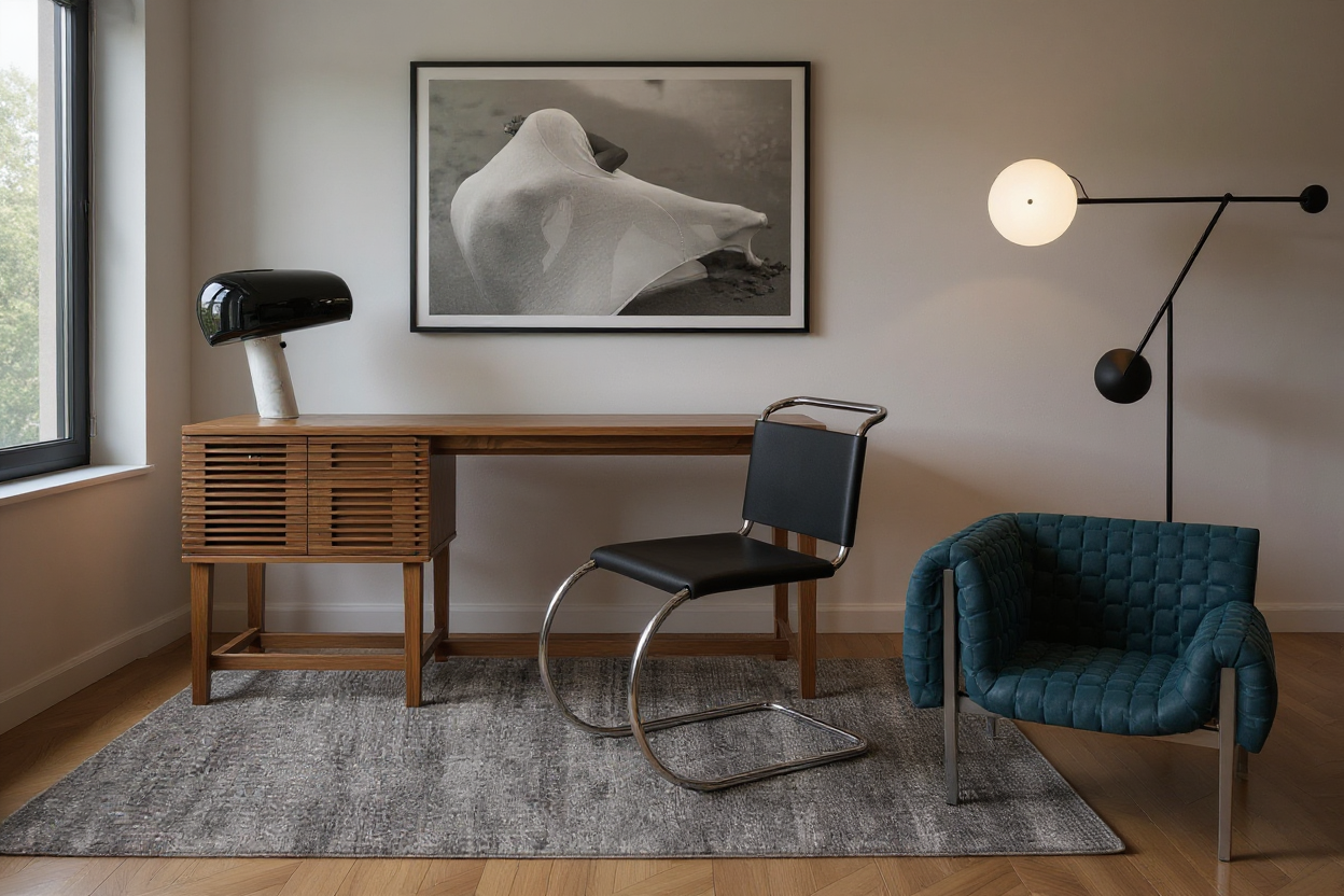 showroom concrete floor white walls double height ceiling black celing track lights art work very big black night stand on the right white night stand on the left
