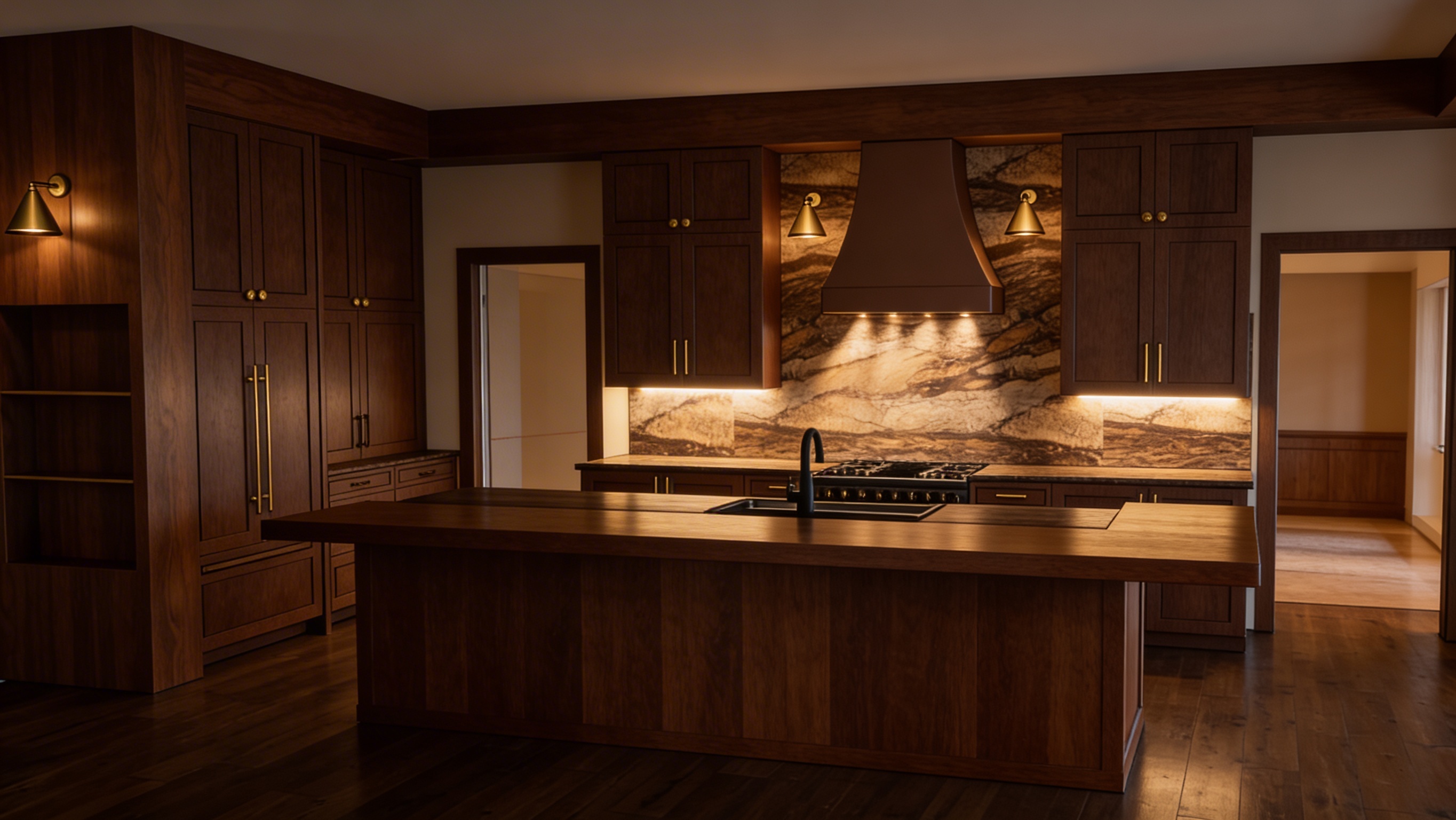 create a photo realistic rendering of a modern kitchen use deep walnut wood tones for the island giving a rich luxurious feel the perimeter cabinets are a black stain on wood graining must be visible all perimeter cabinets must be seen the backsplash and range hood are adorned with a marble pattern in shades of brown and beige adding elegance incorporate matte black handles and fixtures for a sleek contrast the wall sconces should be in brushed brass for warmth and sophistication the flooring is a dark polished hardwood enhancing the overall depth the atmosphere is cozy yet modern with warm ambient lighting creating an inviting and stylish space make the space lighter all cabinet pulls and knobs will be brass the faucet will be matte black overall lighting warm balanced and slightly brighter than current sconces must cast visible downward light beams onto backsplash add soft under cabinet lighting glow do not overexpose or wash out materials maintain warm high end interior mood both side openings must lead into interior rooms not blank or exterior use warm cohesive tones wood taupe soft browns no bright white or harsh contrast slightly dimmer lighting than kitchen
