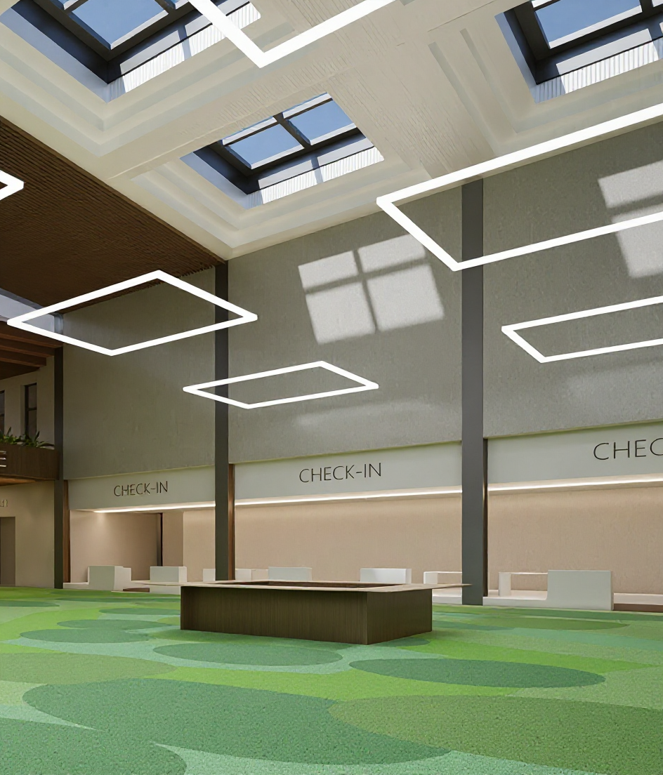 render the image as a modern office building with glass facades and many trees and vegetation in the foreground there s a road with some cars parked the short side side of the building is a single wall that goes straight from the ground to the roof