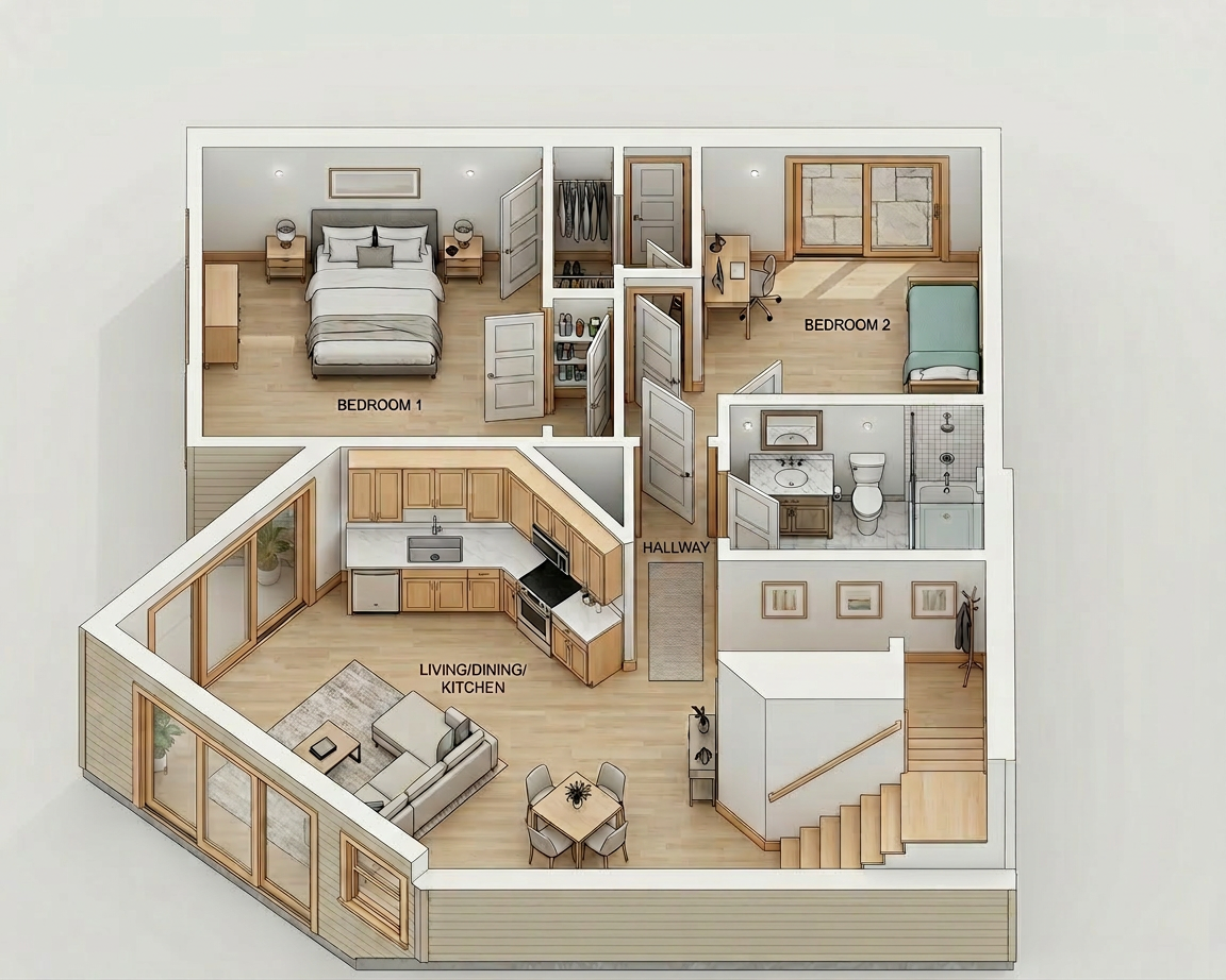 create a realistic image from this kitchen rendering do not alter the layout in any way cabinets are a mocha stain on maple with taj mahal countertops and a creamy beige subway tile add soft interiror lighting