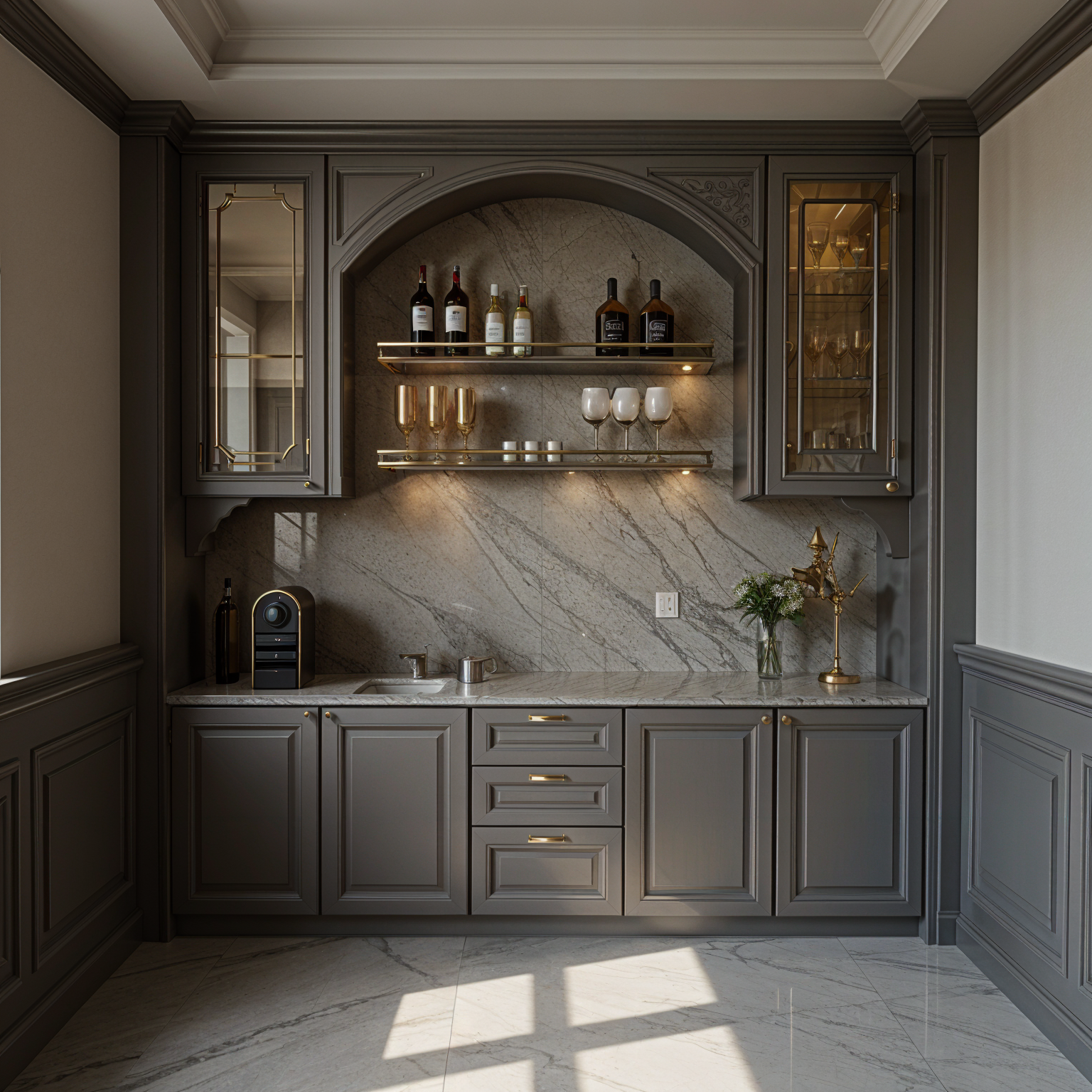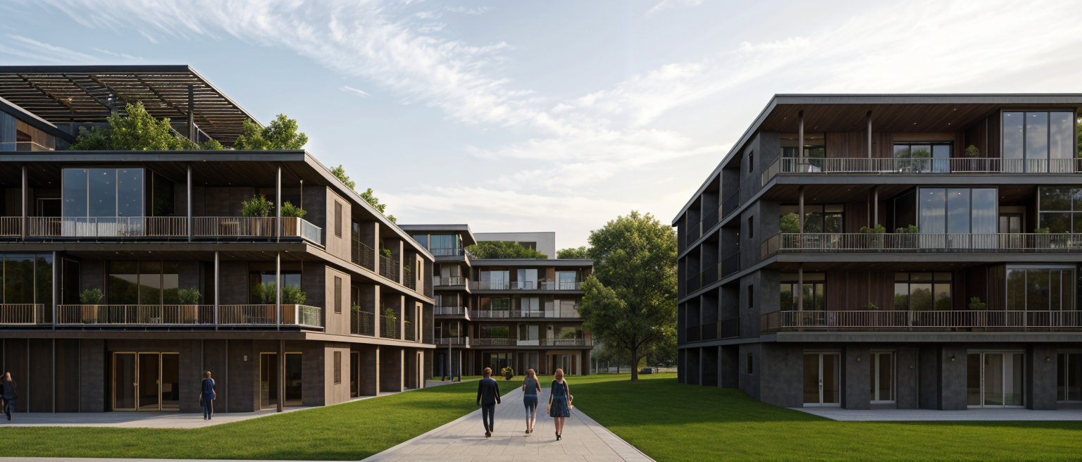 classical exterior shot grass foreground beige townhomes grey gable roof include roads and cars and electric posts watercolor style dark pen outline architecture