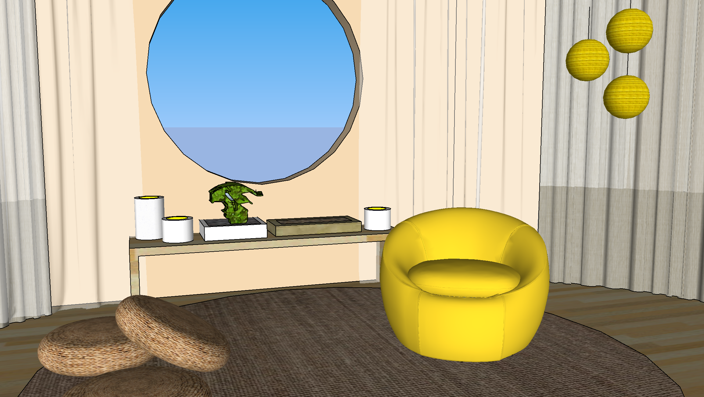 meditation room soft light behind the round window curtains are dual tone beige except for the sheers framing the window light wood floor with round jute rug