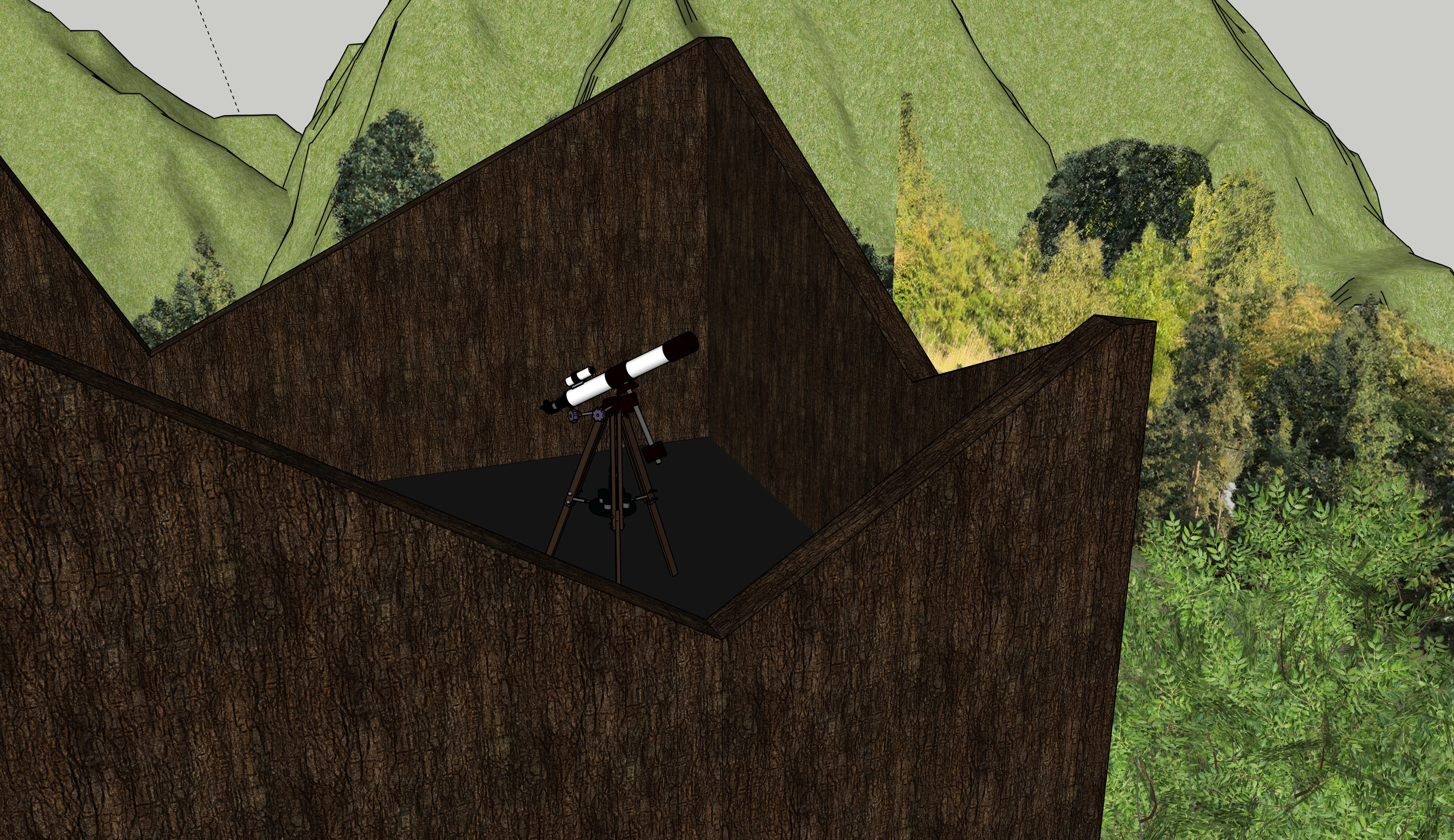 add a person looking out the telescope hills and grass need to look more realistic outside of the building should look like dark bark and the floor should be concrete have a few people looking out at the view too