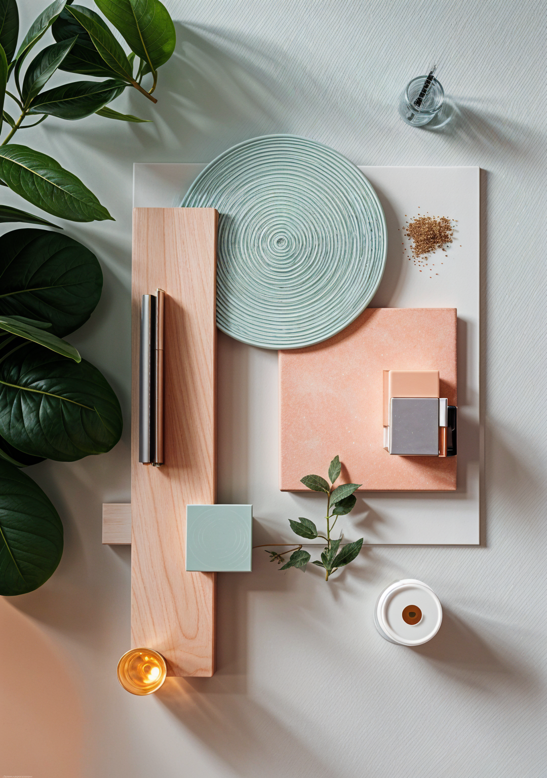 afternoon view of a beach club restaurant at 6pm full lighting in bar and restaurant furnished with yute lamps and each column has light up with floor spotlight an indirect strip light all around the deck makes the deck looks like flying object the furniture are in soft fabric light olive taupe upholstered in this view the sea at the bottem of the page and the left hand side there is hotel and on the right side there is an entrance with palapa