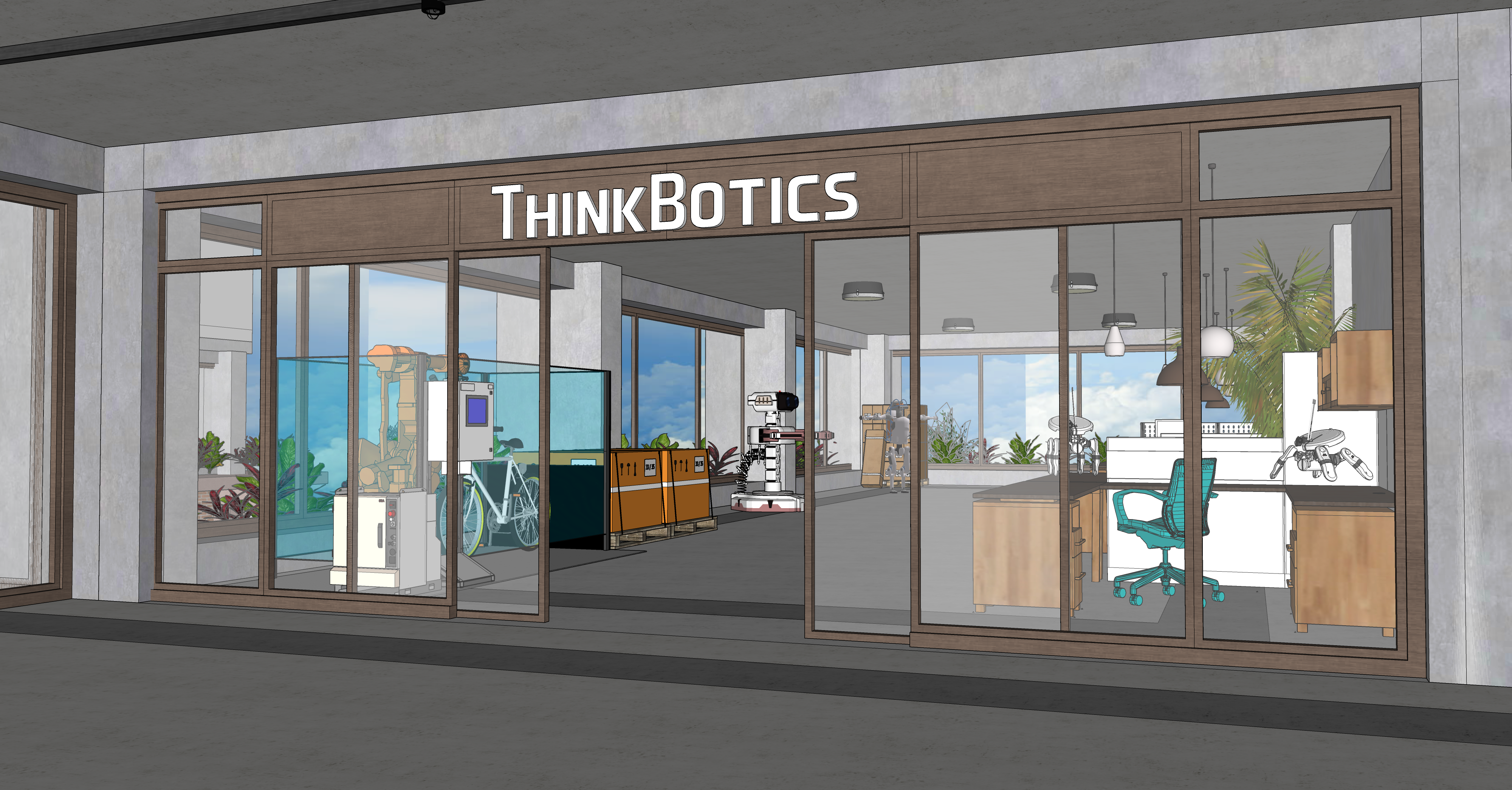 modernist interior shot industrial coworking space wooden details white walls concrete floor light ambience architecture