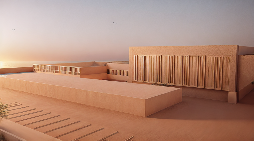 hillside in background with dry native grass the top of the hillside sits just above the roofline in front of the house are an assorted size of red sandstone rocks and a curved concrete driveway enters from the right leading up to the house