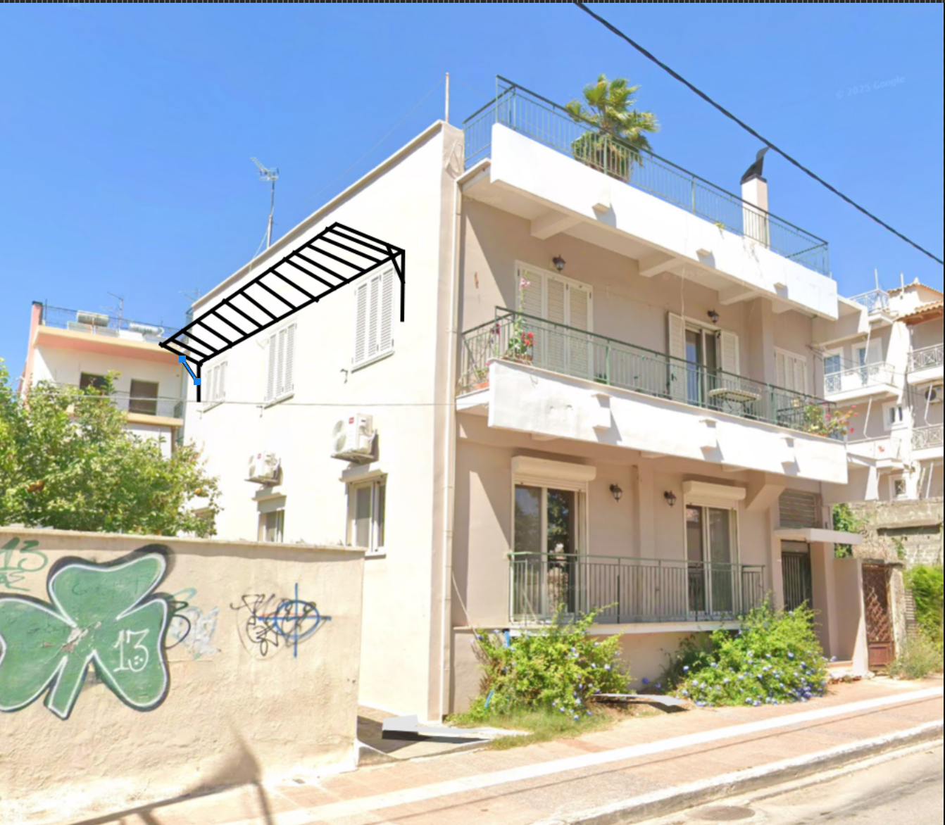 add a pergola with a thin metal frame colored ral 7016 like the sketch keep everything else the same