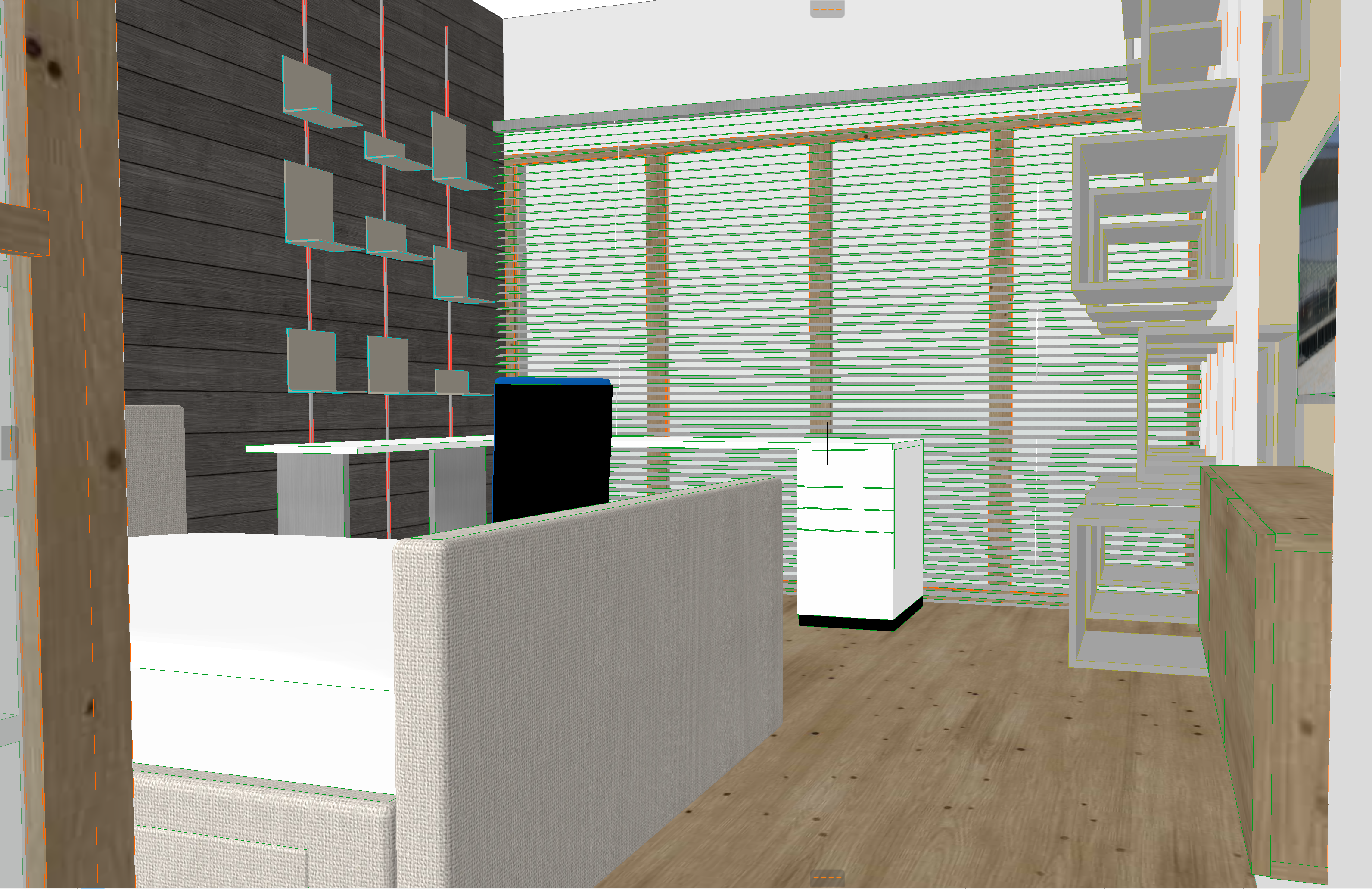 render a modern interior with a cozy and minimalist atmosphere the room features a wooden floor with a natural oak finish and a soft light gray fabric sofa include a white desk and a small white storage unit beside it the wall is adorned with a dark charcoal wood paneling add geometric wall shelves in a soft pastel gray with accents of subtle rose gold lines large windows with light wooden blinds allow soft sunlight to filter in creating a warm inviting glow ensure the color palette remains neutral and soothing emphasizing simplicity and elegance