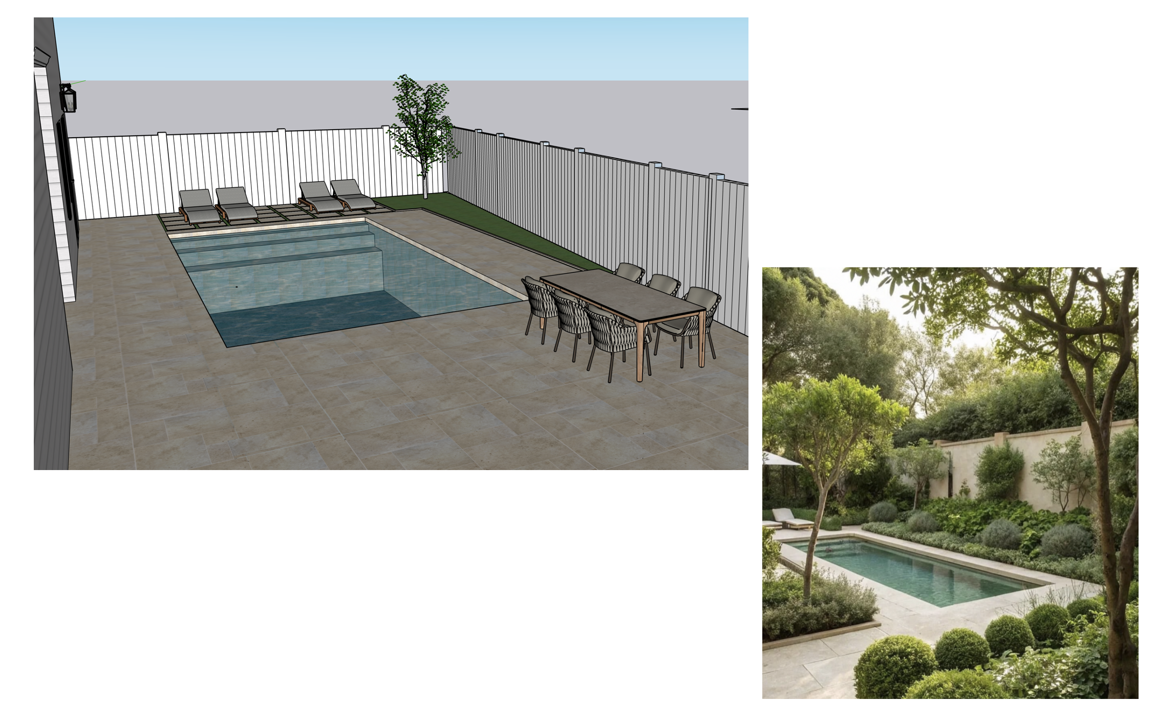 render this exact sketchup model and camera angle keep the pool size decking layout and furniture placement exactly as shown do not redesign the pool shape remove all foliage along the left side of the house that side should remain clean and minimal all landscaping should be focused along the entire back fence only create a dense privacy tree wall along the full back fence line especially behind the loungers privacy tree direction tall mature trees tightly spaced trees tall enough to fully obscure the white fence overlapping canopies so little to no fence is visible natural spacing but visually continuous mediterranean species olive trees podocarpus or similar california privacy trees lush but refined not tropical the fence should barely be visible through the trees understory planting below the trees layered medium shrubs in olive and sage tones rounded boxwood spheres grouped organically soft ornamental grasses low groundcover to soften edges fuller planting in both back corners remove any turf strips create one continuous planted bed along the entire back fence keep 24x24 ivory travertine decking lighting warm brentwood golden hour light soft shadows calm luxury atmosphere overall feeling private brentwood estate backyard dense green backdrop modern mediterranean quiet luxury layered intentional high end photorealistic