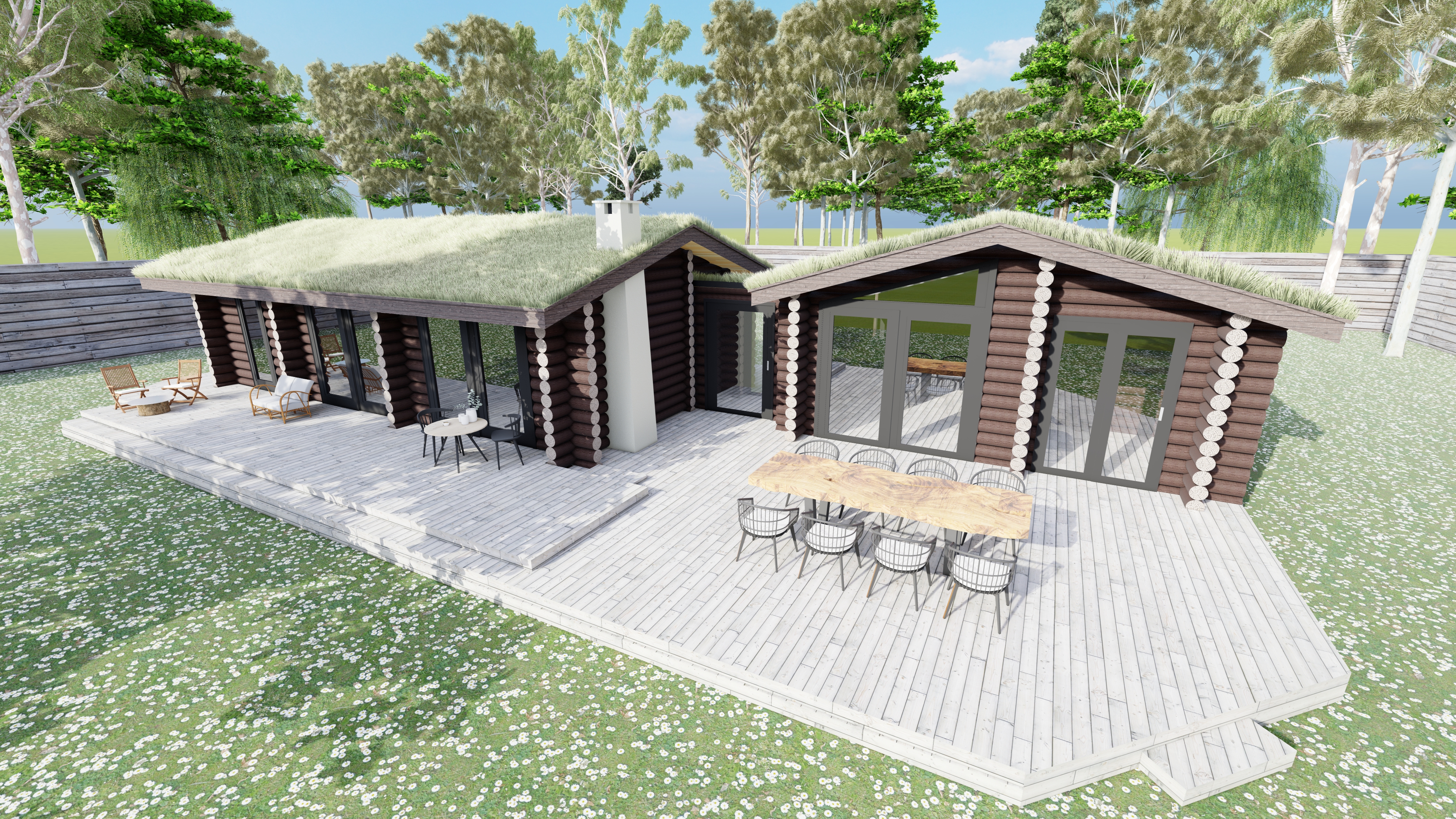 grainy watercolor render of timber frame building with reclaimed wood siding and stone wainscot watercolor trees and urban environment in the background extensive watercolor landscaping surrounding the building