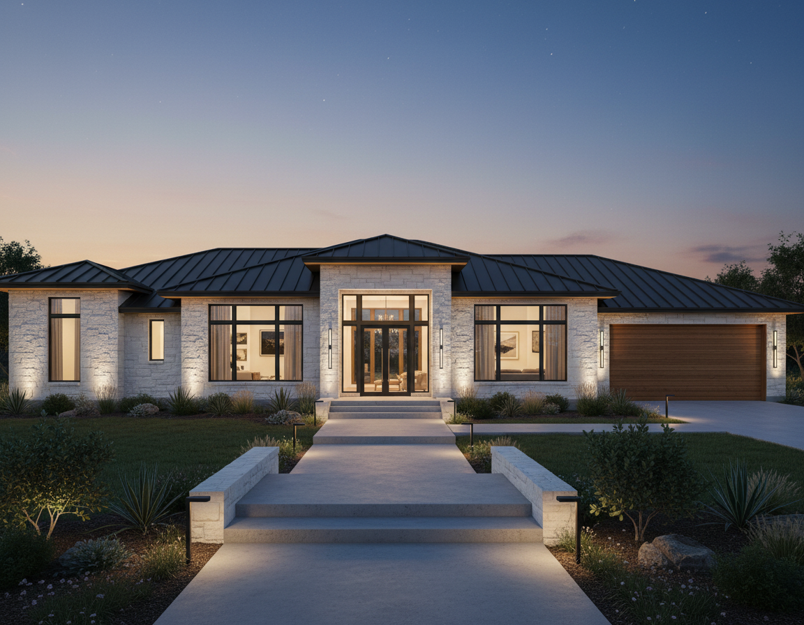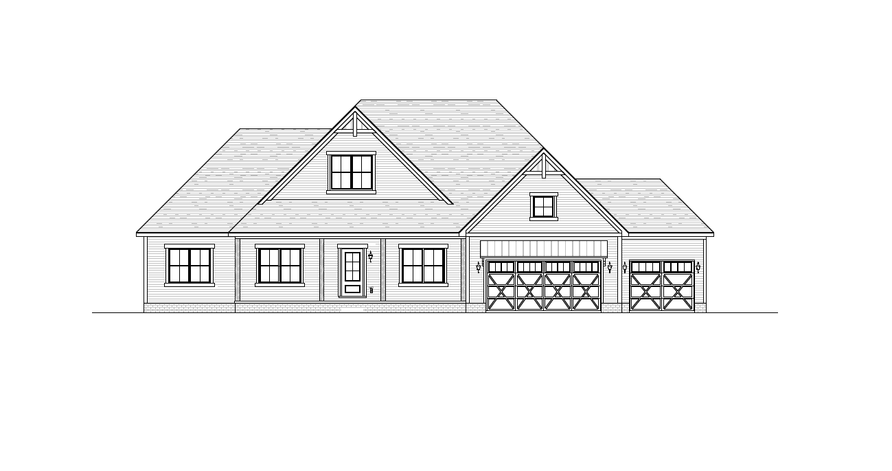 make as photorealistic as possible while keeping textures the same as selection professional landscaping in a lightly wooded scene with good lighting match materials to plan dark grey siding black trim windows garage door black porch post and trim