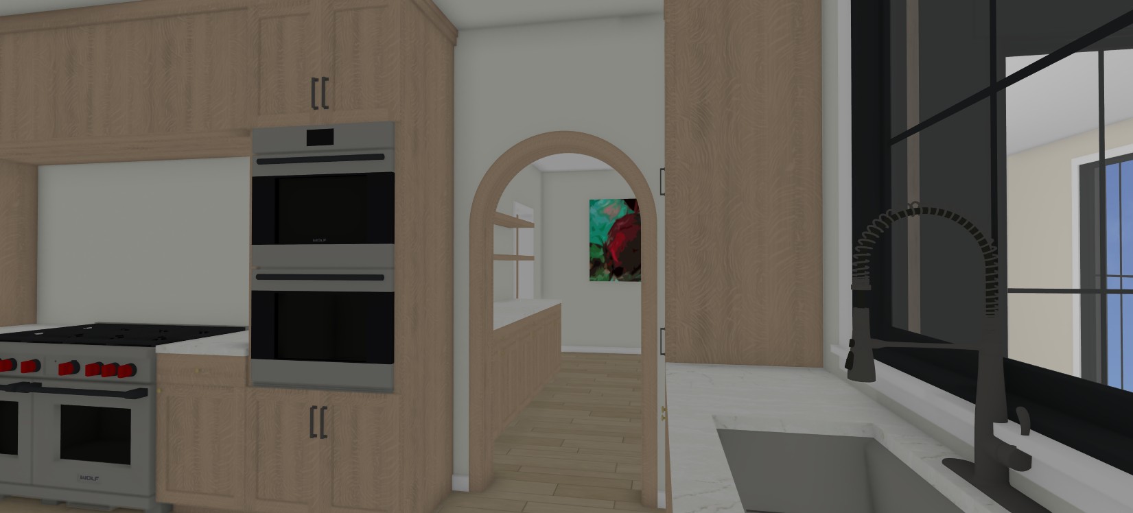 rendering shows a transitional kitchen with white oak cabinetry in the foreground on the left is a wolf double wall oven set in a floor to ceiling cabinet to the left of the wall oven is a 48 inch wolf range a white oak range hood sits above the range extending from one wall cabinet to the other on the immediate right of the image is a large stainless steel workstation sink with a stainless steel faucet the sink is undermounted in a marble countertop centered in the frame is an arched doorway with white oak trim through the doorway is a scullery kitchen with white oak cabinets and marble countertops above the countertop are two white oak shelves the hallway reaches a dead end that has an abstract piece of art hanging on the wall rendering is 8k and hyperrealistic