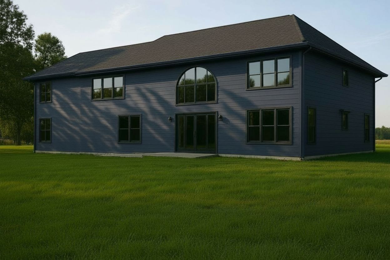 dark blue horizontal siding concrete patio off the sliding doors maintain the current length as this is a huge house