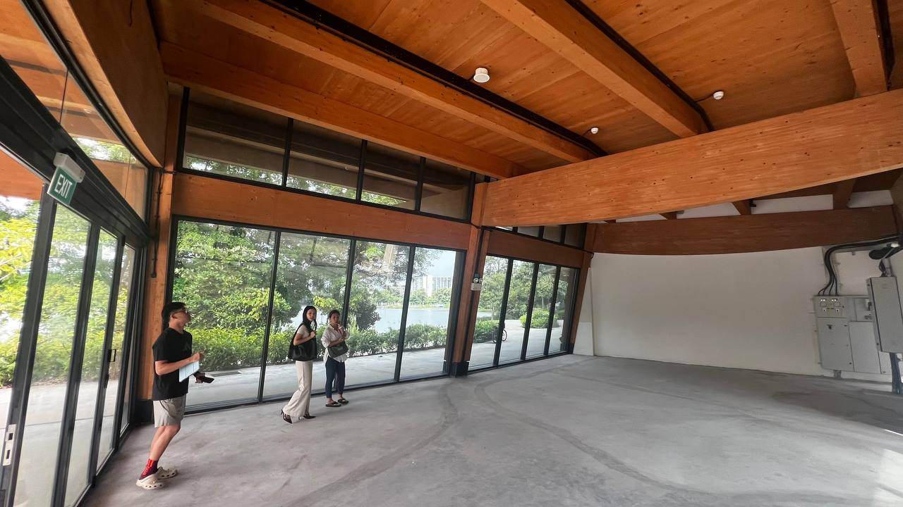 wide angle shot do a render of a biophilic style interior of a programme of a skating school within the interior space there are kids skating within the interior grass patches waves shape on the floor and a coach to teach them floor should be cement screed include carpentry or important safety items around to ensure the space is safe and aesthetically pleasing include hanging lighting with plant designs to accomodate to the timber frame of the pavillion ride side of the image should be an organic curved partion and curved long table counter for the registration of school there are kids skating within the interior and a coach to teach them include carpentry or important safety items around to ensure the space is safe and aesthetically pleasing include hanging lighting with plant designs to accomodate to the timber frame of the pavillion architecture