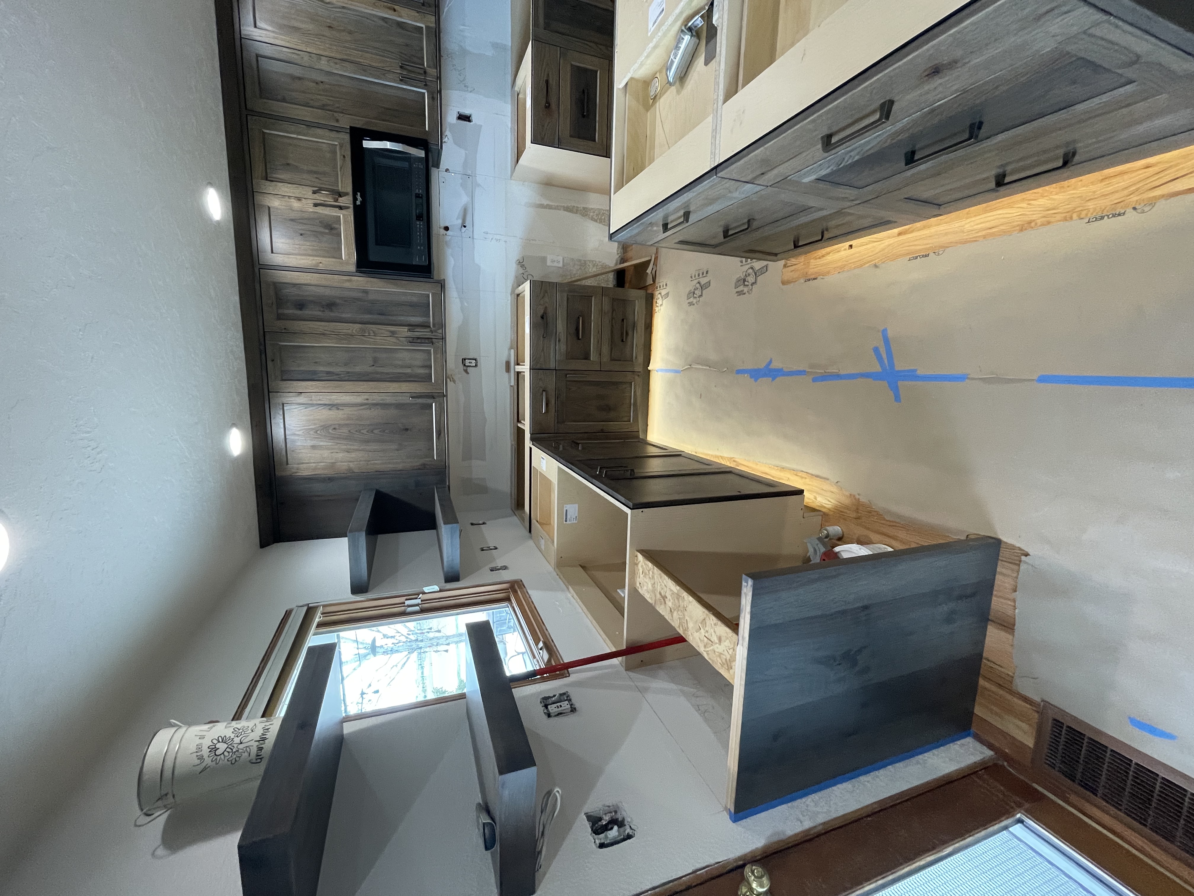 do not change the cabinets in any way preserve the exact cabinet colors materials finishes dimensions door and drawer styles hardware spacing alignment and all geometry exactly as shown do not alter the countertop shape backsplash appliances flooring lighting fixtures or wall structure only remove the construction materials clutter and mess from the scene clean the room and make it look finished and staged add a few simple tasteful home accessories appropriate for the style of the space but do not add or remove any furniture windows or architectural elements maintain the original lighting direction and realism enhance clarity and polish the photo while keeping the cabinetry and room design completely unchanged do not alter the lighting to keep the cabinet colors as they are in the image add a range below the microwave add new flooring and countertops stage for a kitchen
