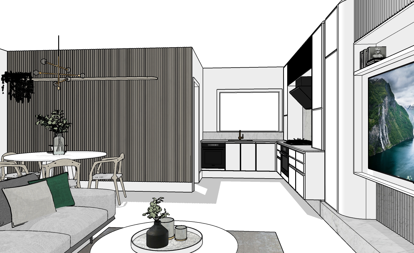 urban tree surrounded apartment showing a tv area with tv and combination light oak tight grain cladding wide plank wood floor oak tight grain and honed natural stone details as noted