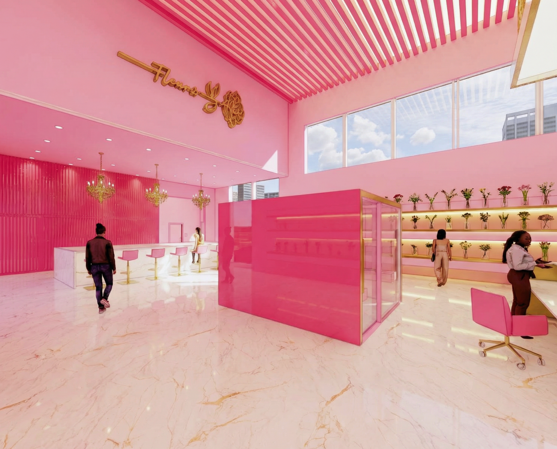 the photo is realistic and the people materials and textures are realistic quality the floor is a white marble with gold veining there is a 3d slat wave texture on the display case in the center that is the same texture as on the back wall it is a bright hot pink the walls are a lighter hot pink there are 3 longer shelves on the back wall that are light hot pink with led lighting under them to show off the product the shelves should have small clear vases of all different kinds of flower stems placed on the shelving each vase should have a different bundle of flowers in them there is a gold sign hanging above the wall the windows should have a view of clouds and buildings in the back there is a bright hot pink wavy texture with 3 gold circular chandeliers hanging with glass detailing above the white marble with gold veining counter the ceiling is a bright hot pink slats with bright led lights in between each one lighting should be bright showing the daylight and still highlighting the product the feeling is luxury