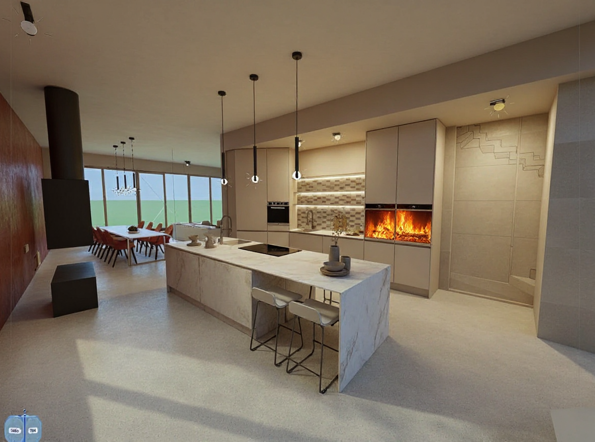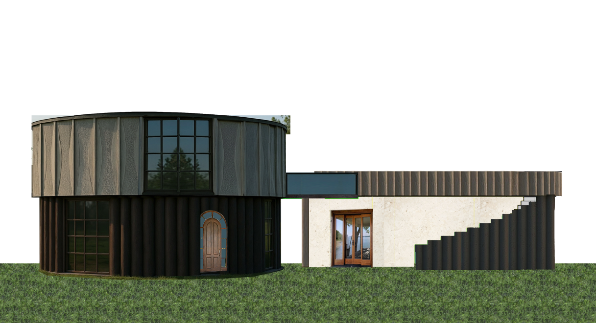 make sunny and add trees exterior shot apply soft daylight with slight haze desaturated earthy tones and a cinematic mood emphasize minimalist composition muted colors and flat entourage silhouettes that blend graphically into the scene reduce hyper real reflections and glossiness adding subtle film grain for a photographic feel final image should feel like a conceptual architectural visualization calm atmospheric and editorial