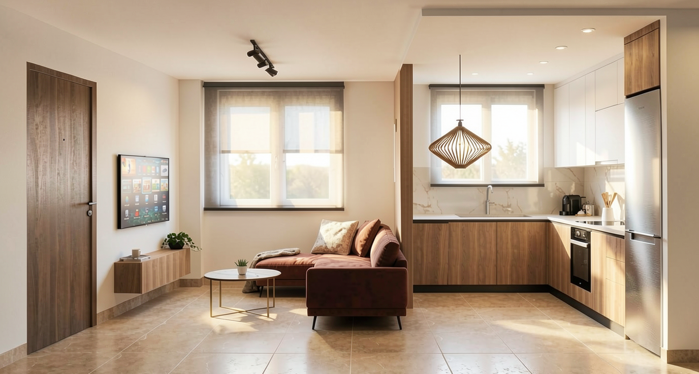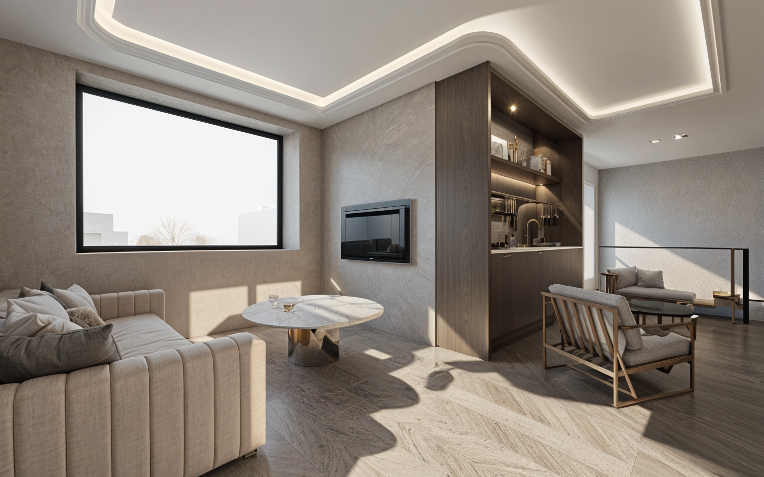 this design is for a tv furniture piece you need to place a large tv in the tall cabinet with the showcase i would like a vertical led light and some decorative items inside and on the wall of the tv put something that matches the countertop above the drawers keep the colors as they are do not change anything