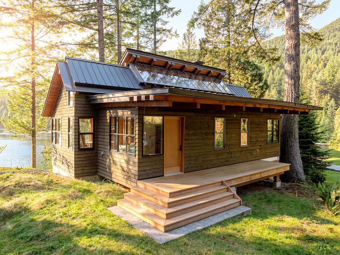 add pine tree to right side of photo partially in front of building show door opened inwards