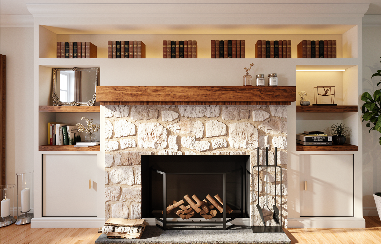 make the wood colour and texture less grains accurate the countertop is travertine less texture the top hung cabinets are light microcement the suspended shelf on the bottom right is the same light microcement laminate