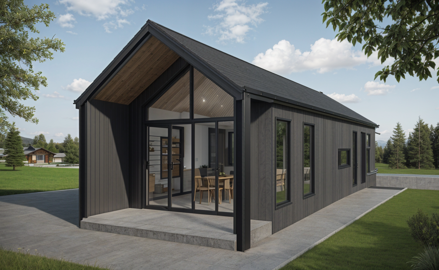 japanese botanical garden outside glass wall between office and kitchen timber flooring