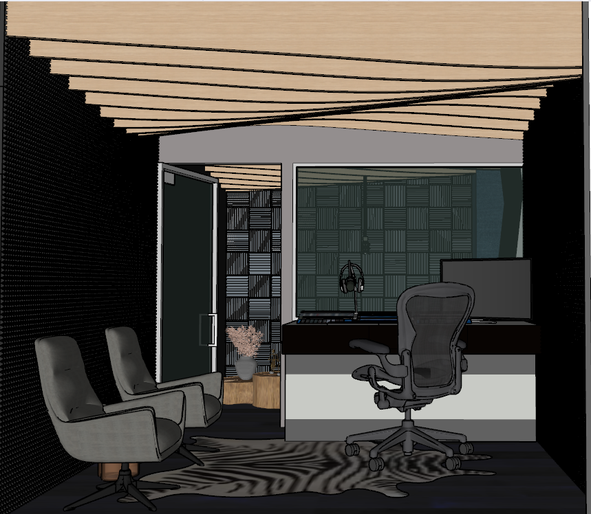 ultra realistic interior rendering of a small modern studio room the space includes a dark acoustic panel wall texture two contemporary grey lounge chairs a zebra pattern rug and a modern ergonomic office chair in front of a sleek desk with a computer monitor and headphones warm wooden ceiling slats with layered depth create soft ambient lighting the back wall features geometric acoustic panels in deep green tones a glass door reflects subtle highlights soft shadows global illumination high detail materials 8k photorealistic render pbr textures physically accurate lighting depth of field crisp reflections cinematic composition