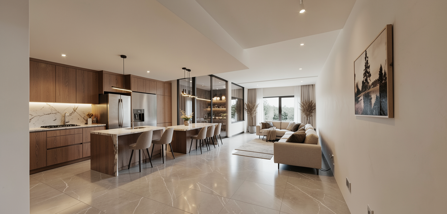 contemporary and luxurious interior of an a well lit open plan kitchen dining combing a spatial living space with cosy sofa at the far end