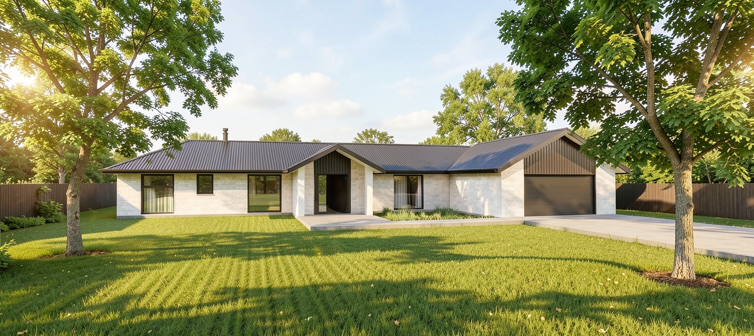 every material has a number denoted to it 1 is heritage brick wall it is red in colour in the front which has two windows 2 is james hardy axon timber look cladding which is white in colour 3 is mid brunswick green 7 is surfmist colorbond corrugated rood cladding