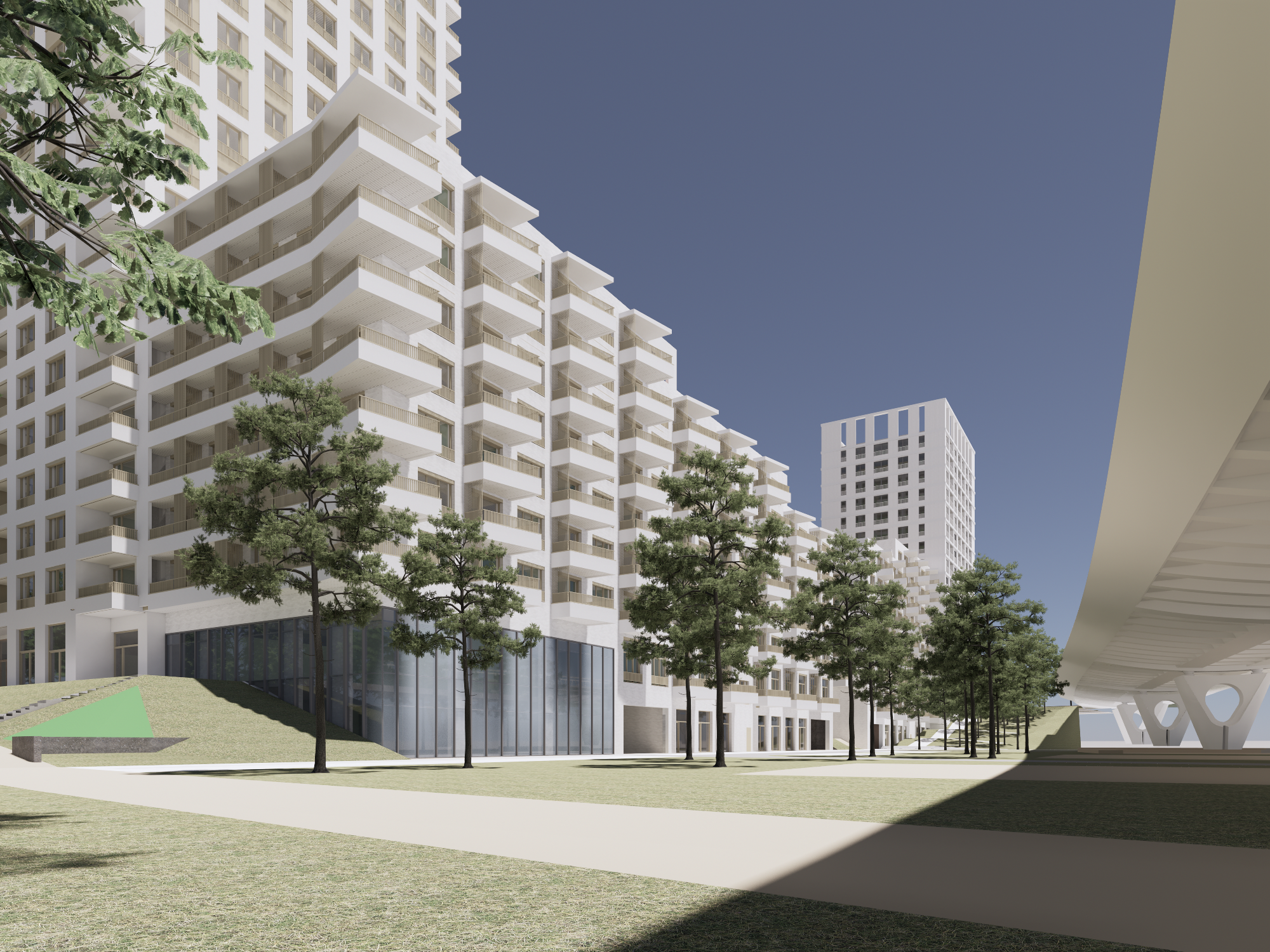 render a modern urban landscape with sleek white high rise buildings under a clear blue sky the buildings should have reflective windows and balconies creating a sense of architecture and symmetry incorporate lush green trees along the base casting soft shadows on the structures the foreground features a light colored paved area and landscaped greenery enhancing the serene and sophisticated atmosphere opt for a vibrant yet tranquil atmosphere emphasizing the interplay of light and shadow to highlight the building s textures and design preserve buidlings geometry and facades