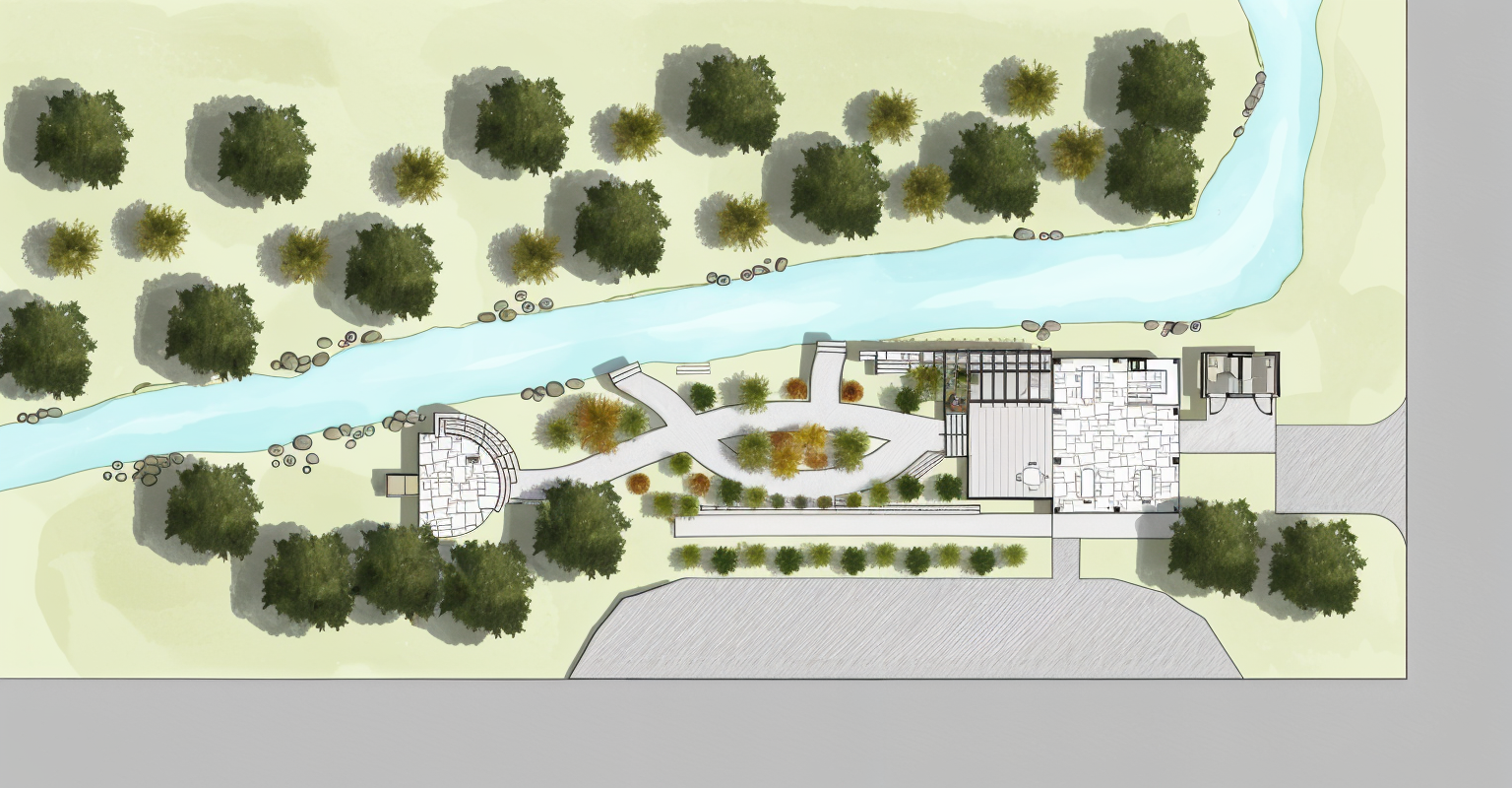 watercolor landscape plan with shadows and occasional rocks along the creek edge architecture