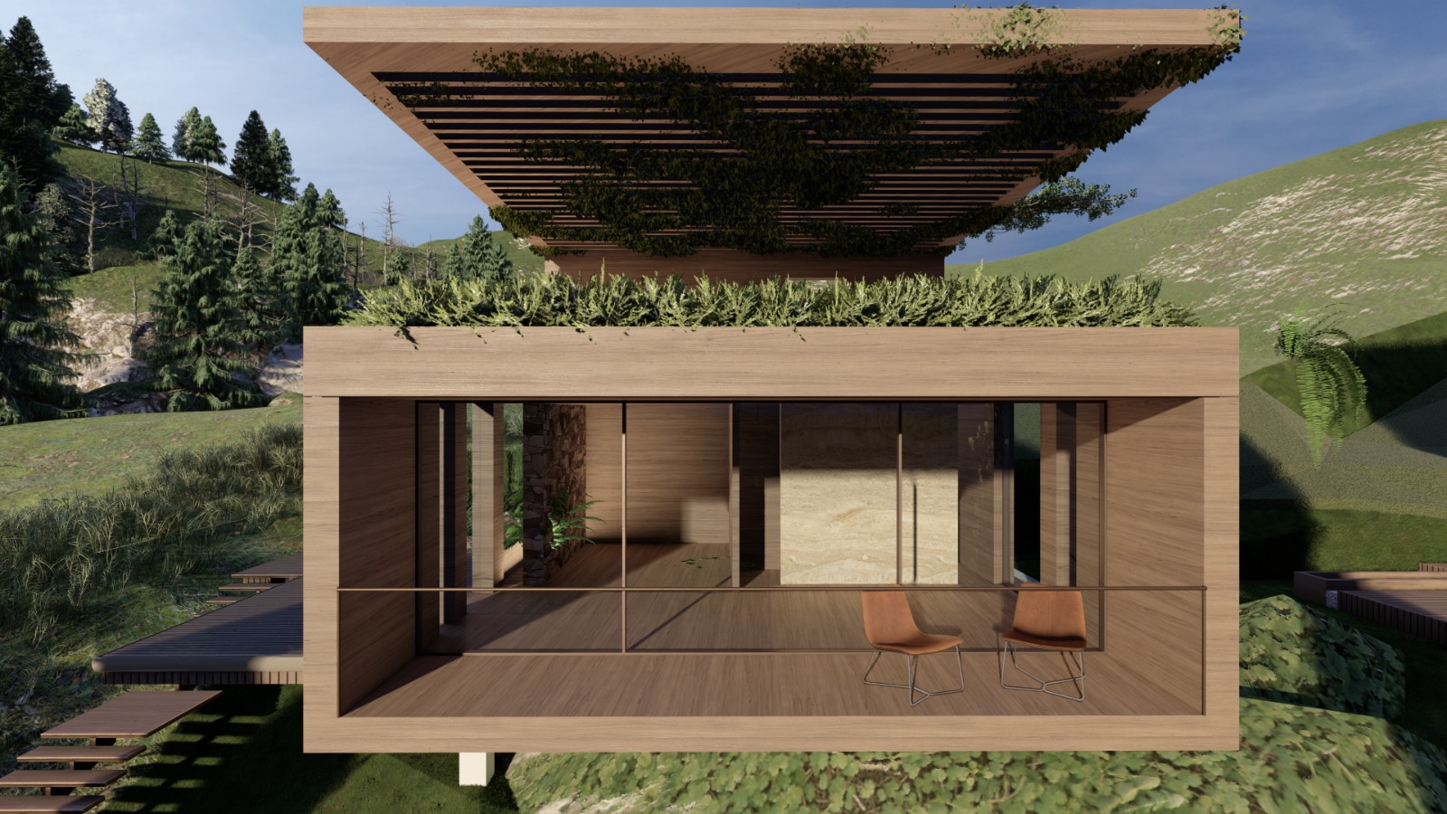 this is an exterior shot of a bungalow i need to make the landscape behind it better change the background and add a landscaped grass area with stone elements introduce a linear row of italian cypress trees adjust the wood finishes to look more natural and realistic and a bit darker add on the upper right a interior living room visible from the exterior with warm and realistic lighting facing the right and in front of the travertine panel on the right a king size bed facing the window on the roof terrace replace the existing plants with creeping fig add flowers in the landscape around the building