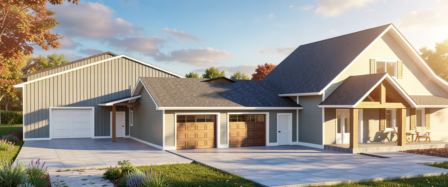 realistic weaher bright day realistic sky realistic grass do not change model the right part of the building will have contrasting grey sheet metal cladding with vertical grooves