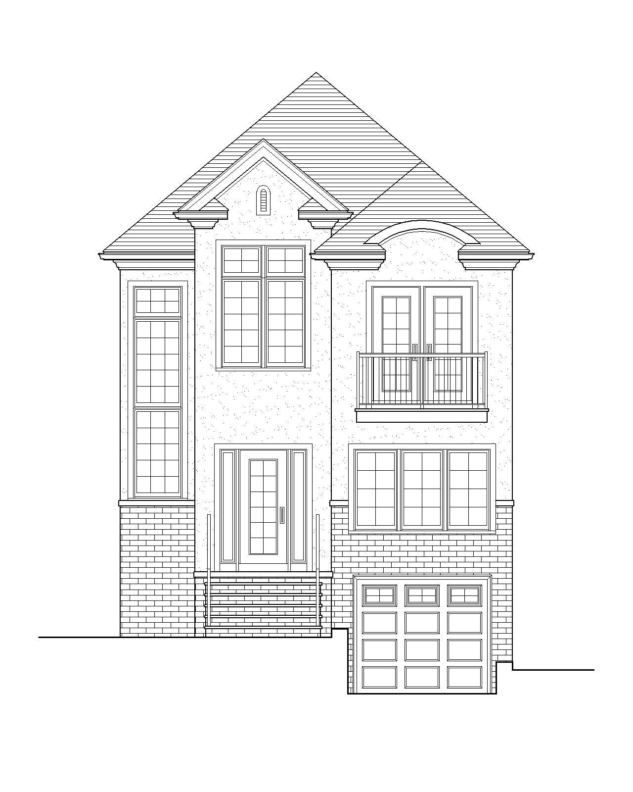 render this elevation realistic in a setting with some light landscaping in a residential neighborhood the windows and doors should be black the brick should be a natural color and stucco should be in a light modern color