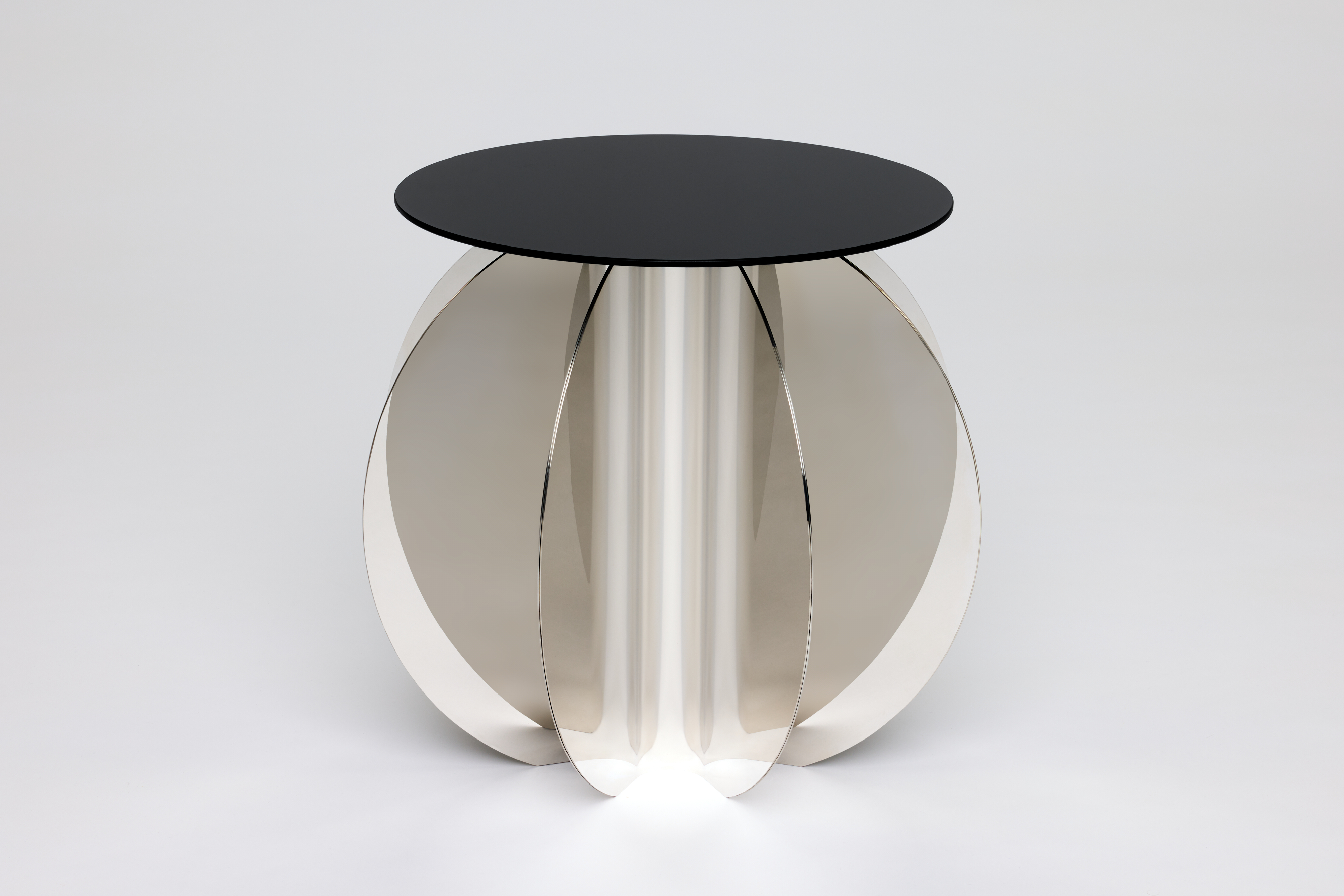 place the polished stainless steel object in a modern minimalist concrete shell interior morning light view outside to a city skyline keep original image proportions the spherical fin base object is 550mm in diameter and height change the perspective view back to the the original source image 3 4 view from above make the tablr 60 smaller
