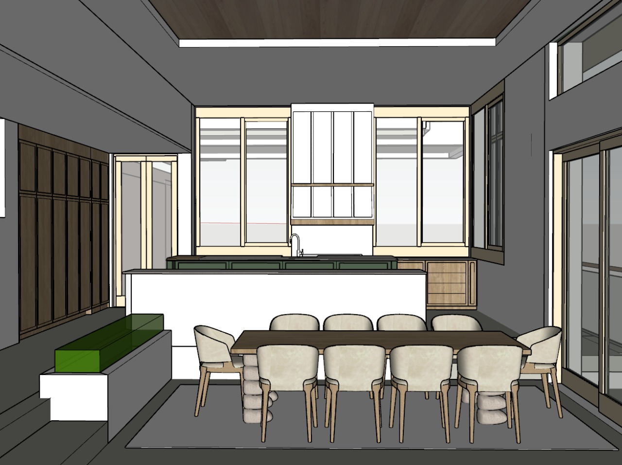 interior shot the style is modern classic sheker kitchen doors with knurled gold handles the countertops are ceaserstone blanco drift the floors are oggie white oak in the dining room and myra marble from womag on the passage and kitchen raised section the dining chairs are valentino walkabout toast from hertex haus there is a lush green garden view through the windows on either side of the extractor the hood cabinet is the same as the wall colour plascon dried leaf the kitchen island is duco sage green and there is a butcher block section as shown the dining table has an oak top with duco legs as per design shown