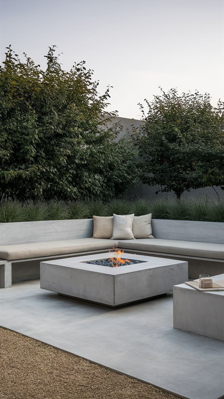 exterior shot modern minimalist white couches sleek design light grey concrete floor lush green bushes adding a touch of nature the sky above is clear and bright blue creating a fresh and tranquil atmosphere