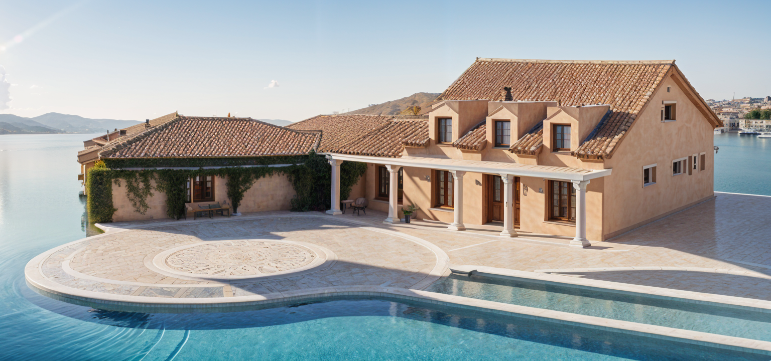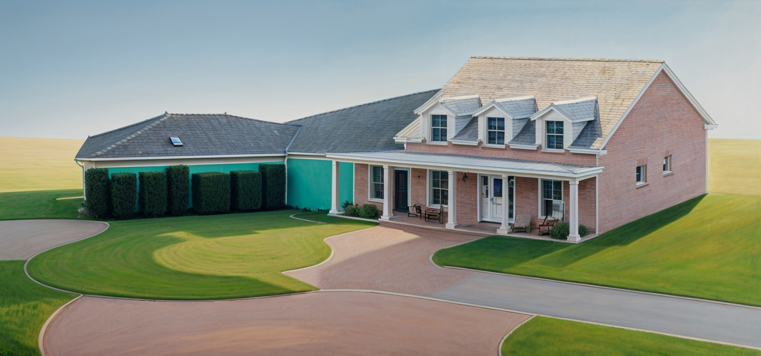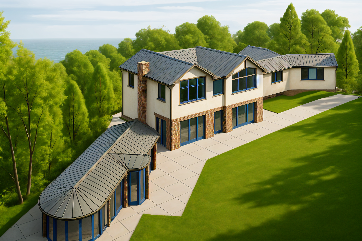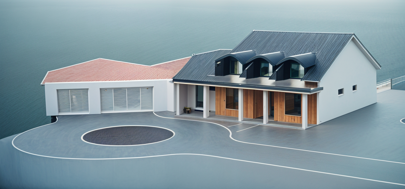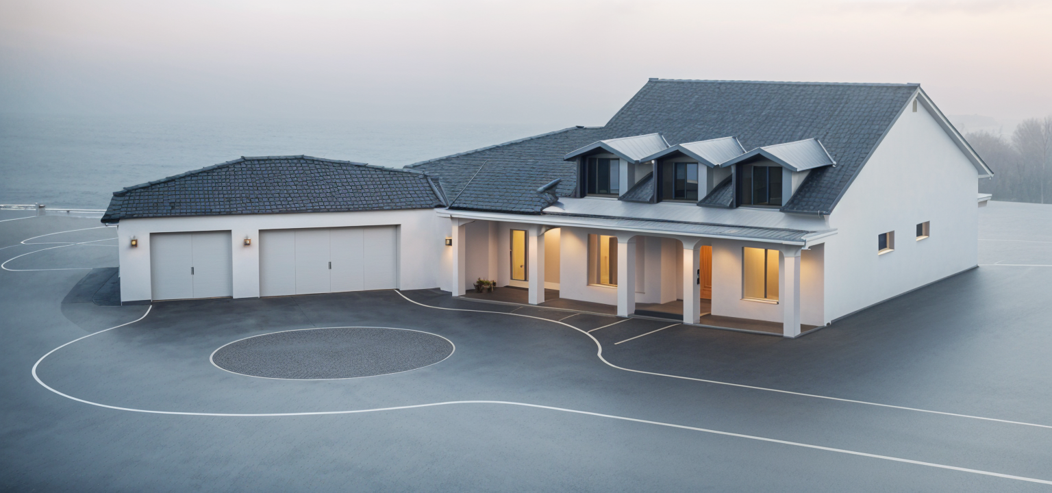 a modern farmhouse white walls and with metal dark gray roofing and a 3 car garage on the left white hardi plank horizontal exterior walls surrounded by lush greenery in florida setting plain concrete porte cochere surround it with palm trees and a dawn setup with lights lit up architecture