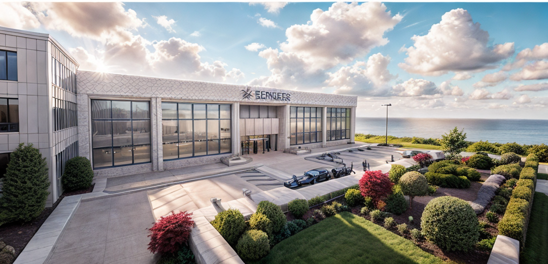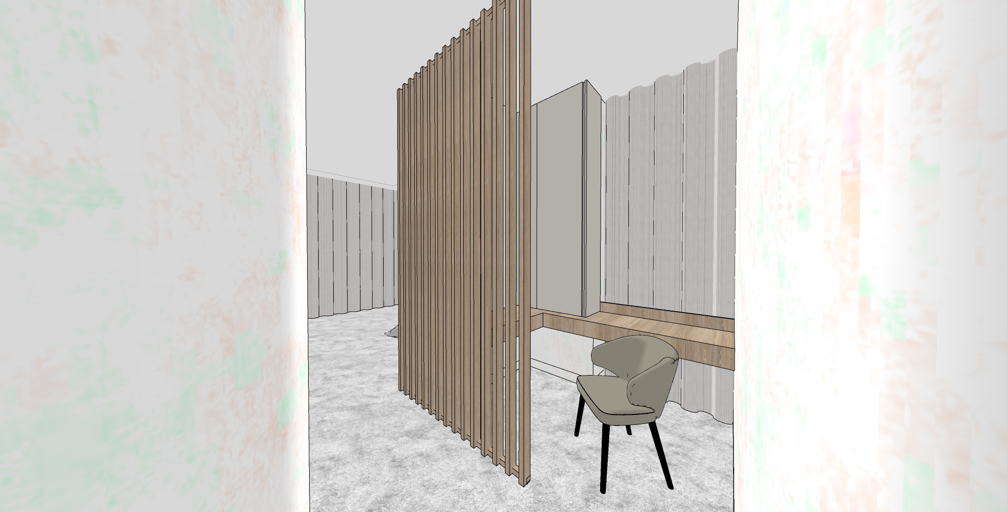 create a serene modern interior space with a minimalist design the room features a soft warm gray color palette with walnut wood accents the partition wall consists of vertical slats made of warm walnut wood offering a natural touch the walls are smooth with curved corners with a muted matte texture soft warm gray colour the floor is polished concrete a sleek modern chair with an olive green cushion and black legs complements the space ambient lighting adds a gentle inviting glow creating a tranquil and sophisticated atmosphere bright natural light comes into the room via sheer curtains also make the interior brighter