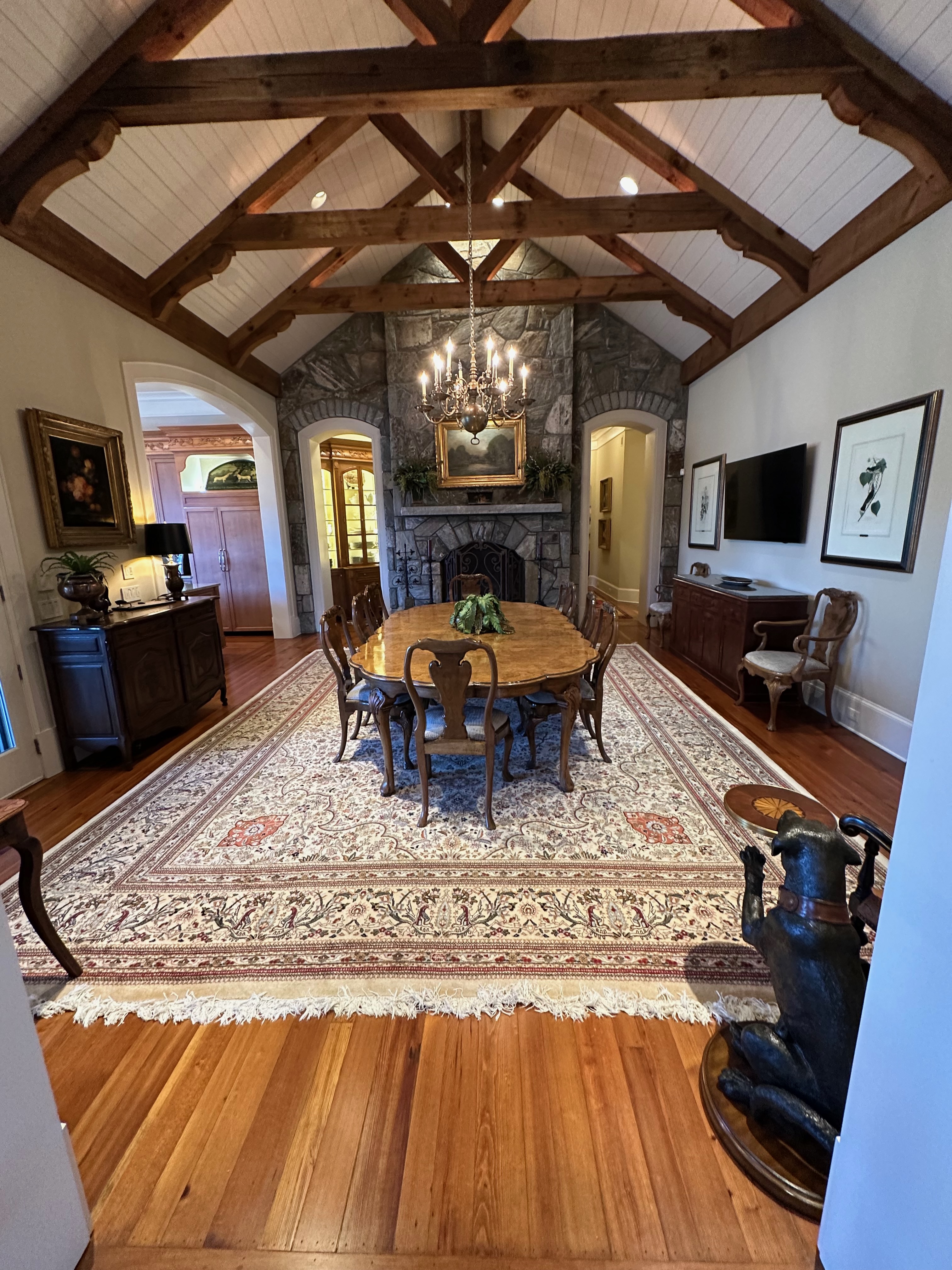 turn this into a kitchen keep stone wall remove firebox and add 48 inch range with 24 inch side cabinets add large copper hood over cooktop place large kitchen island in the middle horizontally add wall of floor to ceiling cabinets on right side with built in refridgerator