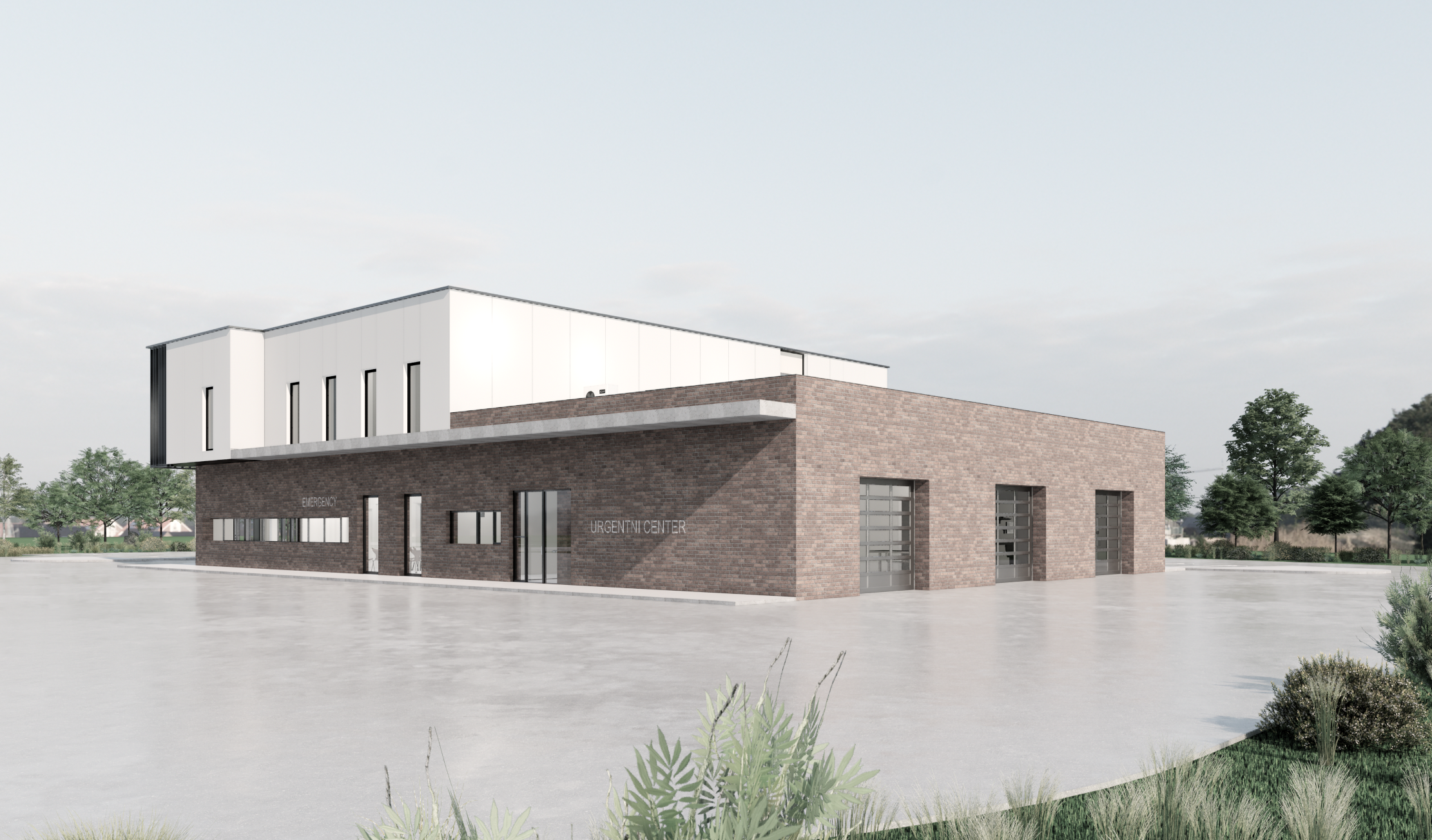modern sleek mood clouds in the back lots of trees and greenery keep the pavement the same make reflections in the windows preserve all existing text on signs and surfaces