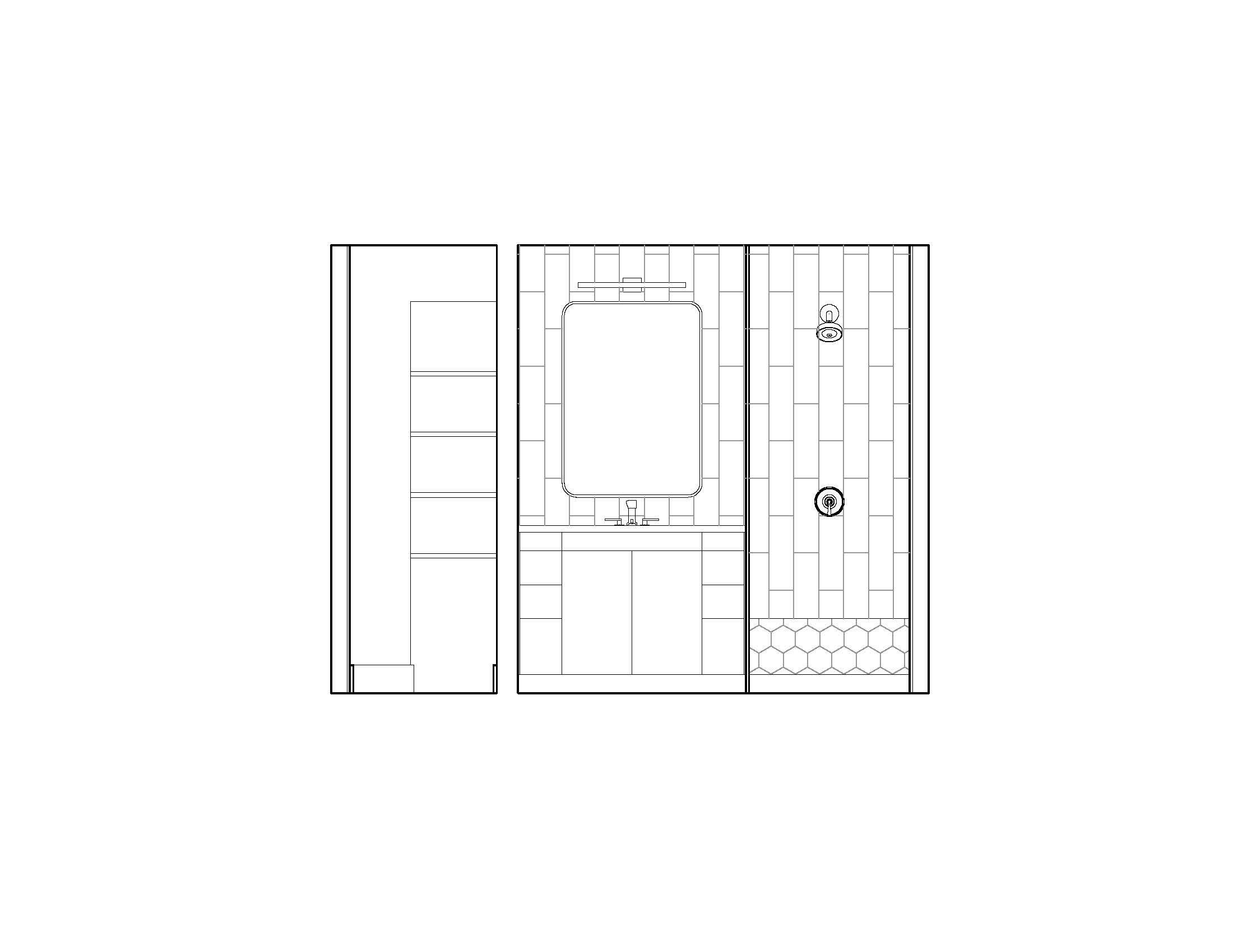 modern bathroom with black fixtures and light wood cabinetry wall between vanity and shelves