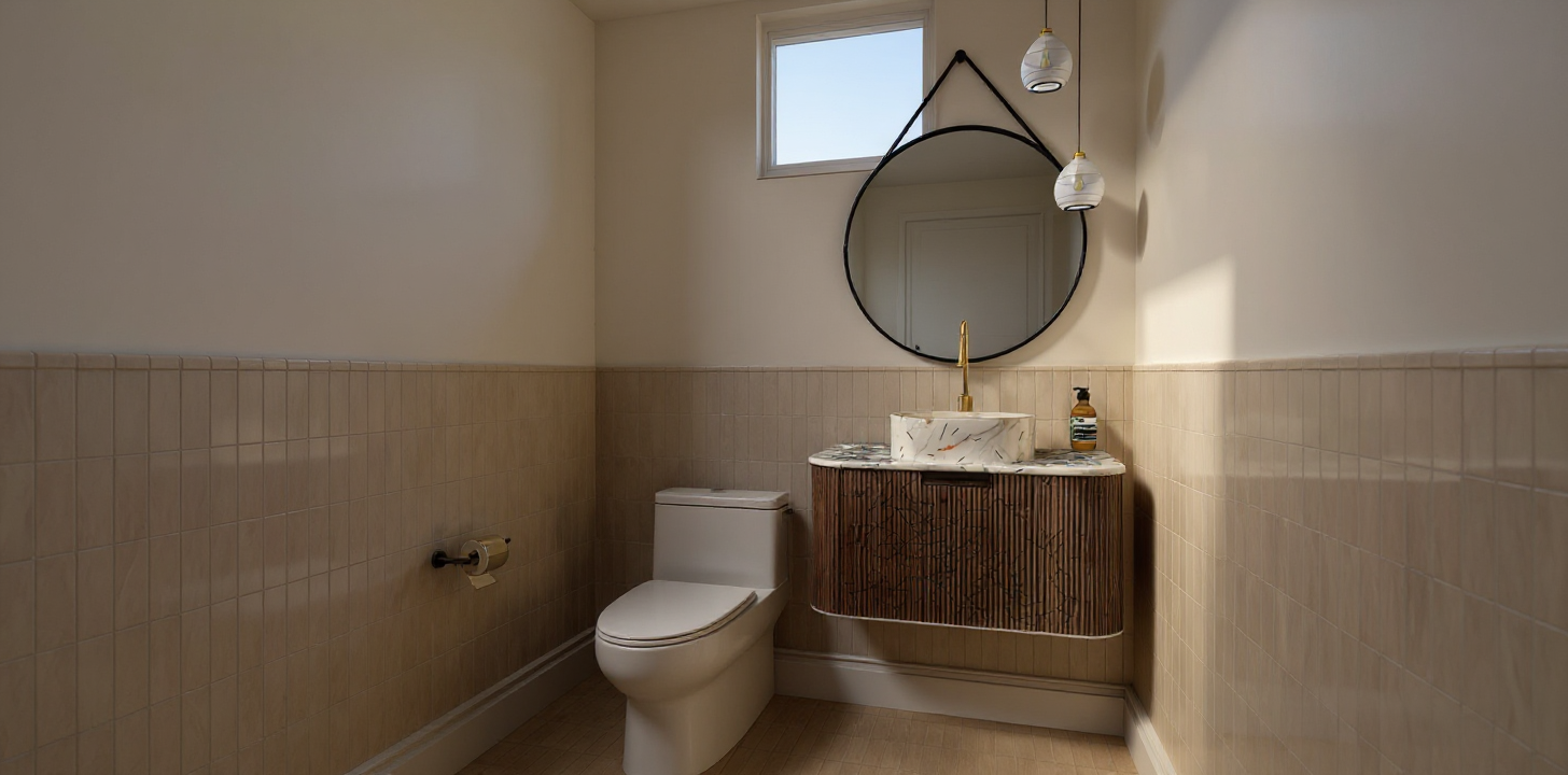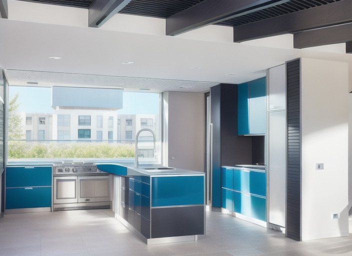 make the cabinets high gloss navy blue and the floor a high gloss white with a rectangular rug