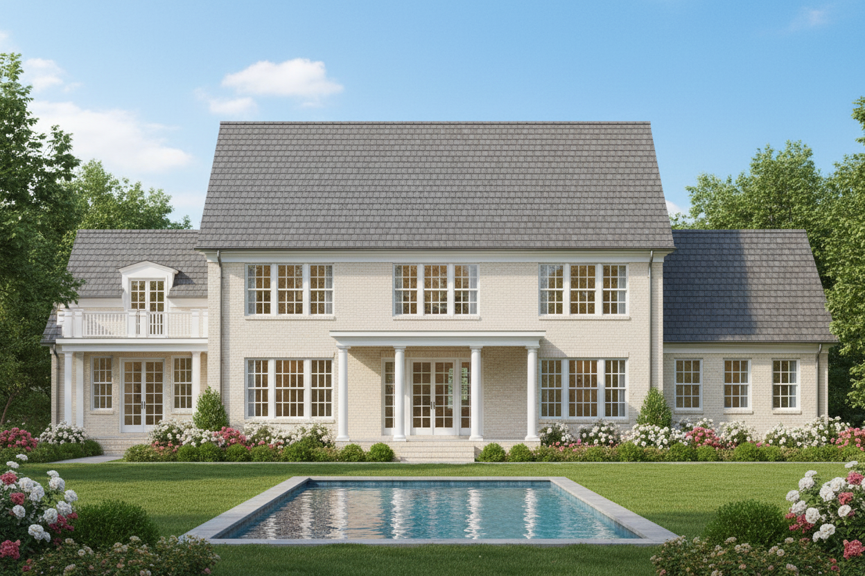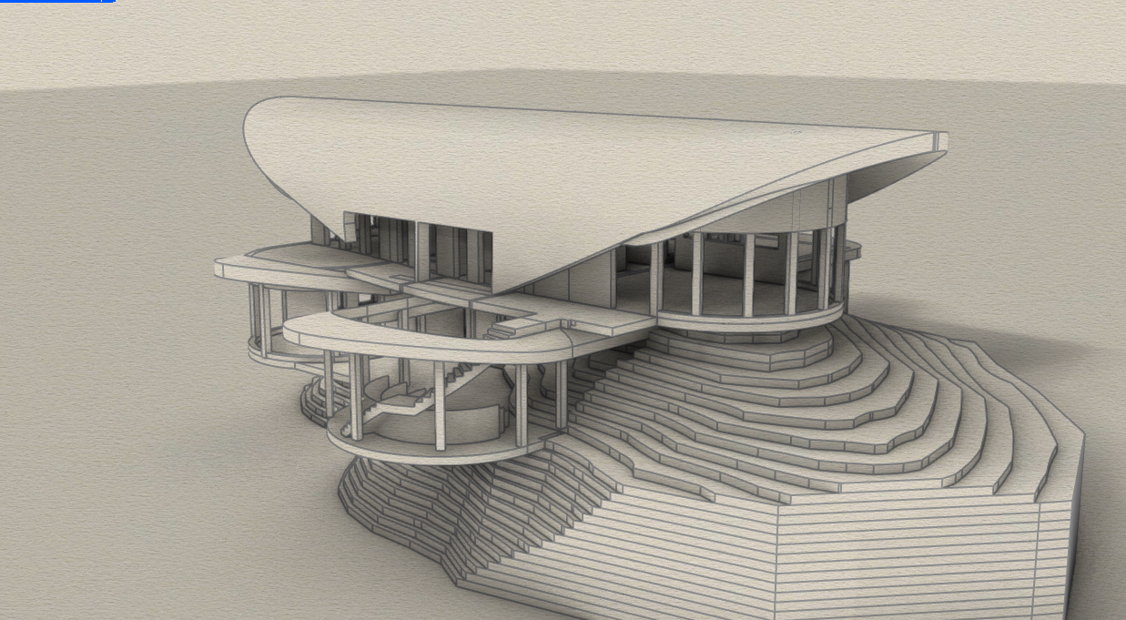 2 story research facility perched off a cliff sitting at a high elevation background filled with cloudy blue sky and mountains fog beneath it black corrugated metal roof gray metal panel walls floor to ceiling glass framed with black steel warm light coming from the inside outdoor deck with amphitheater and curved roof above it railings along the balconies and deck