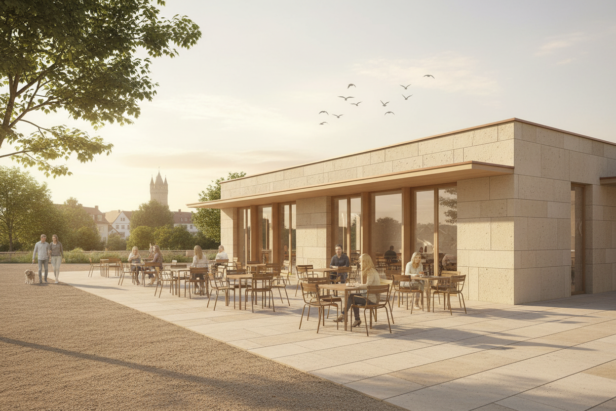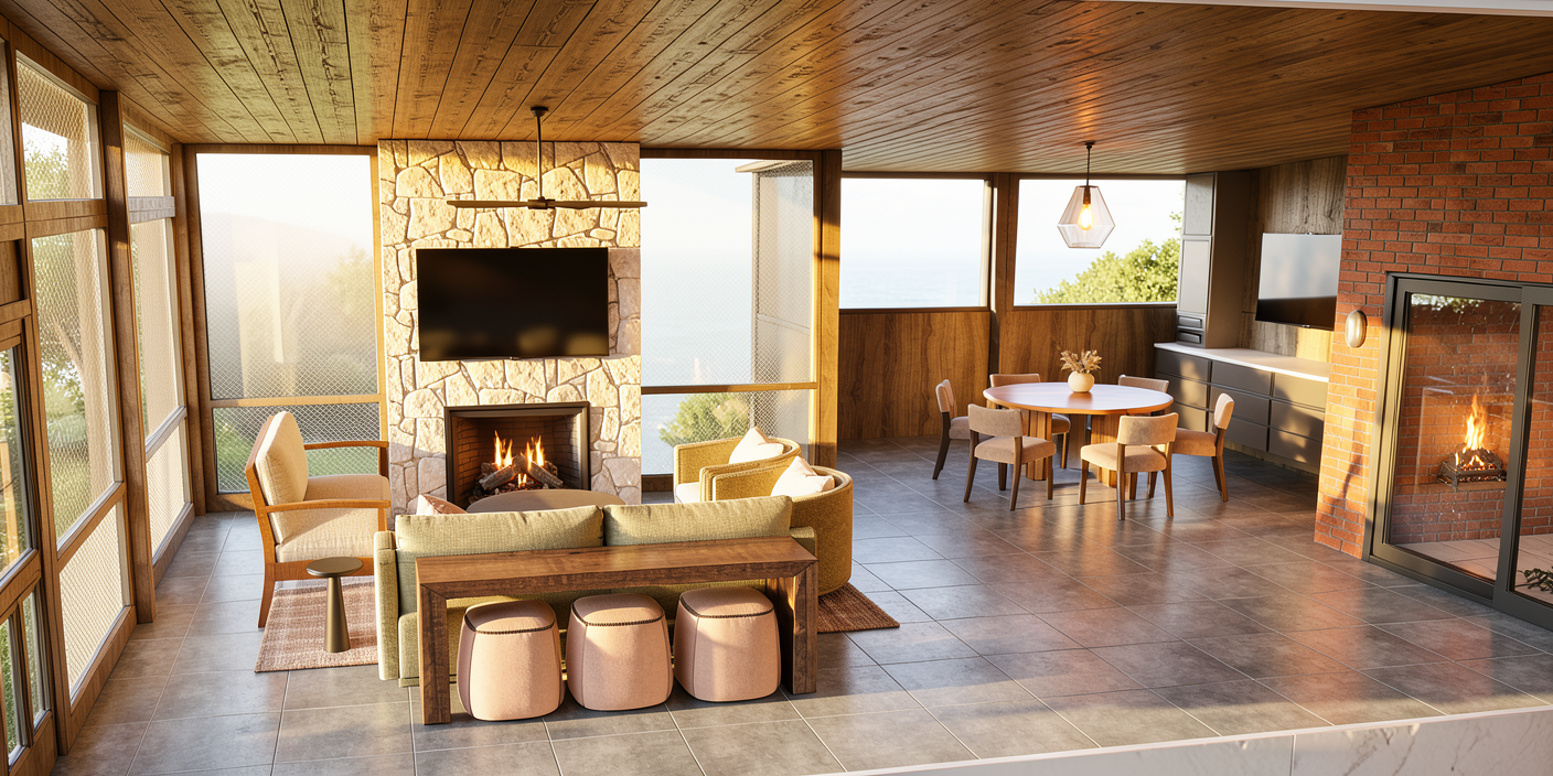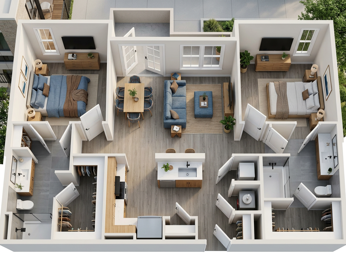 keep evrything the same unless i say otherwise turn the track lights and can lights on to make the space brighter make the green glass chandlier in the back look refelcted my the sun and lit up nicely add planters with plants on the brown table to the left and make the table a red wood finish make all the railing matte black as well as the window frames make the outside the windows look like kansas street landscape look realistic and perspective from the second floor looking out add a professionally dress black women to one of the brown chairs reading a book and add a women sitting at the bar table talking on her phone