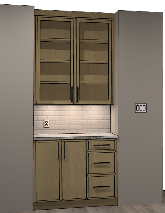modern bar with light maple cabinets black handles honed marble countertop and backsplash decorate with sophisticated bar details evening filtered sunlight shing from behind viewpoint
